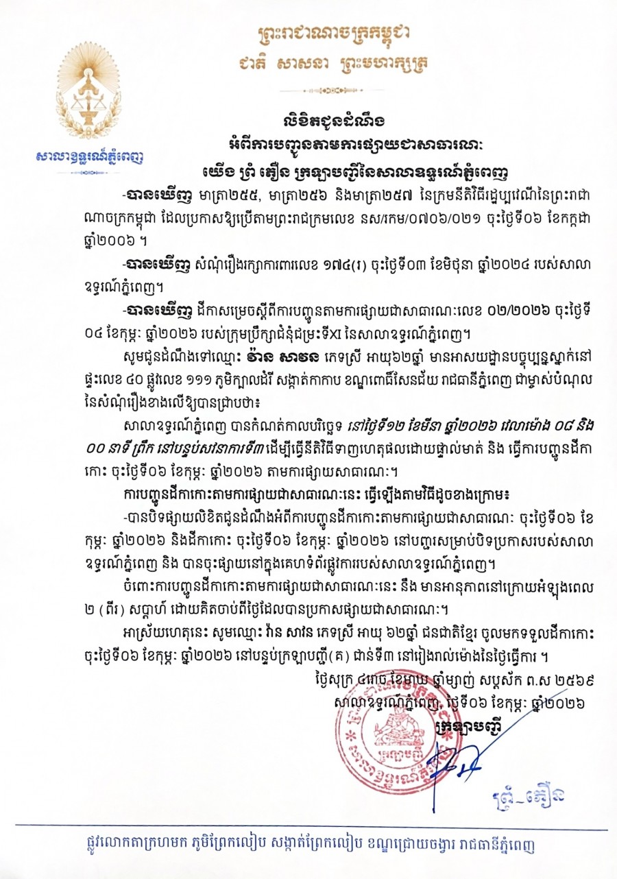 យើង ព្រំ ភឿន ក្រឡាបញ្ជីសាលាឧទ្ធរណ៍ភ្នំពេញ សូមជូនដំណឹងមកឈ្មោះ វ៉ាន សាវន ភេទស្រី អាយុ៦២ឆ្នាំ ជនជាតិខ្មែរ មានអាសយដ្ឋានបច្ចុប្បន្នស្ថិតនៅផ្ទះលេខ៤០ ផ្លូវលេខ១១១ ភូមិក្បាលដំរី សង្កាត់កាកាប ខណ្ឌពោធិ៍សែនជ័យ រាជធានីភ្នំពេញ ជាភាគីម្ចាស់បំណុលនៃសំណុំរឿងរដ្ឋប្បវេណីលេខ ១៧៤(រ) ចុះថ្ងៃទី០៣ ខែមិថុនា ឆ្នាំ២០២៤ ឱ្យបានជ្រាបថា សាលាឧទ្ធរណ៍ភ្នំពេញបានកំណត់យកថ្ងៃទី១២ ខែមីនា ឆ្នាំ២០២៦ វេលាម៉ោង ០៨ៈ០០នាទីព្រឹក នៅសាលសវនាការទី៣ ដើម្បីធ្វើនីតិវិធីទាញហេតុផលដោយផ្ទាល់មាត់។