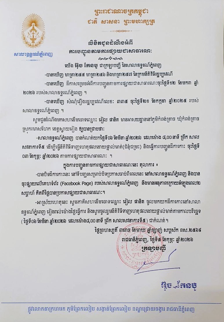 យើង អ៊ុច កែនបូ ក្រឡាបញ្ជីសាលាឧទ្ធរណ៍ភ្នំពេញ សូមជូនដំណឹងមកឈ្មោះ រៀល ផានិត មានអាសយដ្ឋានបច្ចុប្បន្នស្ថិតនៅភូមិកំពង់ត្រាច ឃុំកំពង់ត្រាច ស្រុករមាសហែក ខេត្តស្វាយរៀង ជាភាគីសហដើមចោទនៃសំណុំរឿងរដ្ឋប្បវេណីលេខ ៣៣៥ ចុះថ្ងៃទី២១ ខែកក្កដា ឆ្នាំ២០២៥ ឱ្យបានជ្រាបថា សាលាឧទ្ធរណ៍ភ្នំពេញបានកំណត់យកថ្ងៃទី០៦ ខែមីនា ឆ្នាំ២០២៦ វេលាម៉ោង ០៨ៈ០០នាទីព្រឹក នៅសាលសវនាការទី៥ ដើម្បីធ្វើនីតិវិធីទាញហេតុផលដោយផ្ទាល់មាត់។