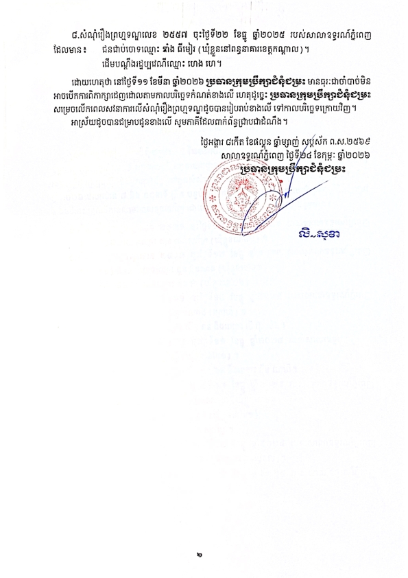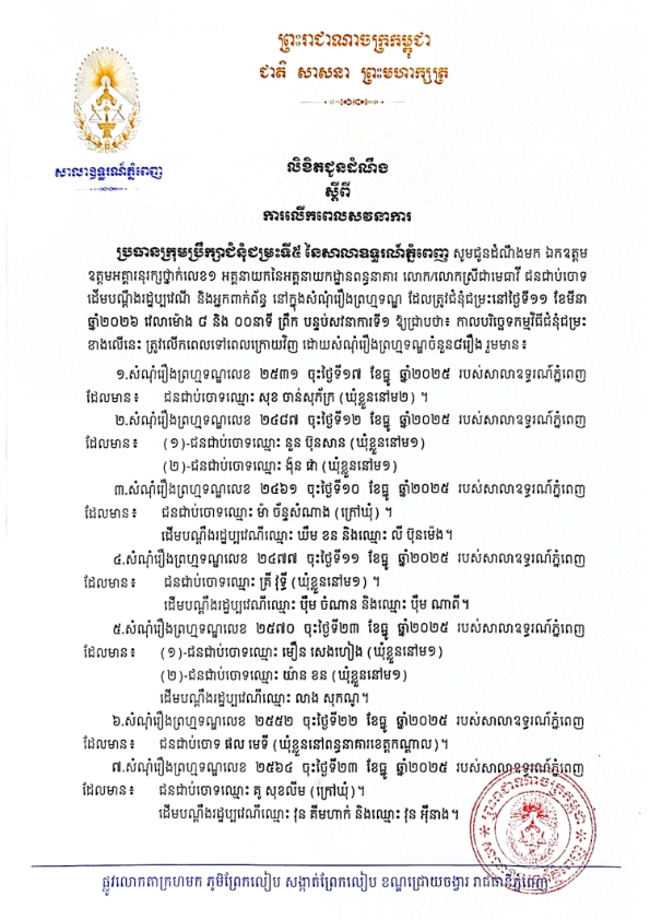 ប្រធានក្រុមប្រឹក្សាជំនុំជម្រះទី៥ នៃសាលាឧទ្ធរណ៍ភ្នំពេញ សូមជូនដំណឹងមក ឯកឧត្តម ឧត្តមអគ្គានុរក្សថ្នាក់លេខ១ អគ្គនាយកនៃអគ្គនាយកដ្ឋានពន្ធនាគារ លោក/លោកស្រីជាមេធាវី ជនជាប់ចោទ ដើមបណ្តឹងរដ្ឋប្បវេណី និងអ្នកពាក់ព័ន្ធសំណុំរឿងព្រហ្មទណ្ឌ ដែលបានធ្វើការកោះហៅ និងអញ្ជើញឱ្យចូលរួមពិភាក្សាដេញដោលដែលនឹងប្រព្រឹត្តទៅនៅថ្ងៃទី ១១ ខែមីនា ឆ្នាំ២០២៦ វេលាម៉ោង ០៨ៈ០០នាទីព្រឹក នៅសាលសវនាការទី១ ដែលមានលោក លិ សុខា ជាប្រធានក្រុមប្រឹក្សាជំនុំជម្រះ ឱ្យបានជ្រាបថា កម្មវិធីពិភាក្សាដេញដោលតាមកាលបរិច្ឆេទខាងលើត្រូវលើកទៅពេលក្រោយវិញ ដោយប្រធានក្រុមប្រឹក្សាជំនុំជម្រះមានធុរៈជាចាំបាច់។
