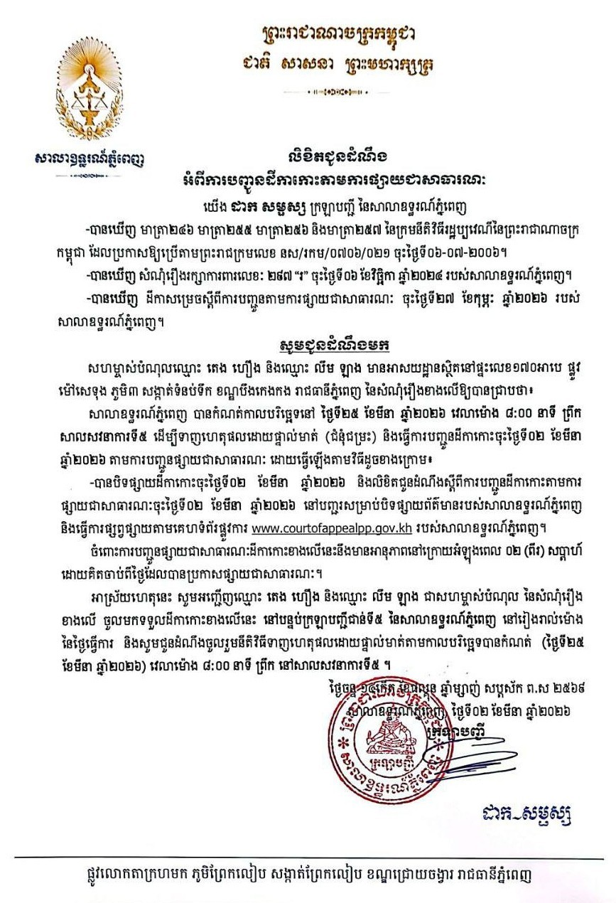 យើង ដាក សម្ផស្ស ក្រឡាបញ្ជីសាលាឧទ្ធរណ៍ភ្នំពេញ សូមជូនដំណឹងមកឈ្មោះ តេង ហឿង និងឈ្មោះ លីម ឡាង មានអាសយដ្ឋានបច្ចុប្បន្នស្ថិតនៅផ្ទះលេខ១៧០អាបេ ផ្លូវម៉ៅសេទុង ភូមិ៣ សង្កាត់ទំនប់ទឹក ខណ្ឌបឹងកេងកង រាជធានីភ្នំពេញ ជាភាគីសហម្ចាស់បំណុលនៃសំណុំរឿងរក្សាការពារលេខ ២៩៧(រ) ចុះថ្ងៃទី០៦ ខែវិច្ឆិកា ឆ្នាំ២០២៤ ឱ្យបានជ្រាបថា សាលាឧទ្ធរណ៍ភ្នំពេញបានកំណត់យកថ្ងៃទី២៥ ខែមីនា ឆ្នាំ២០២៦ វេលាម៉ោង ០៨ៈ០០នាទីព្រឹក នៅសាលសវនាការទី៥ ដើម្បីធ្វើនីតិវិធីទាញហេតុផលដោយផ្ទាល់មាត់។