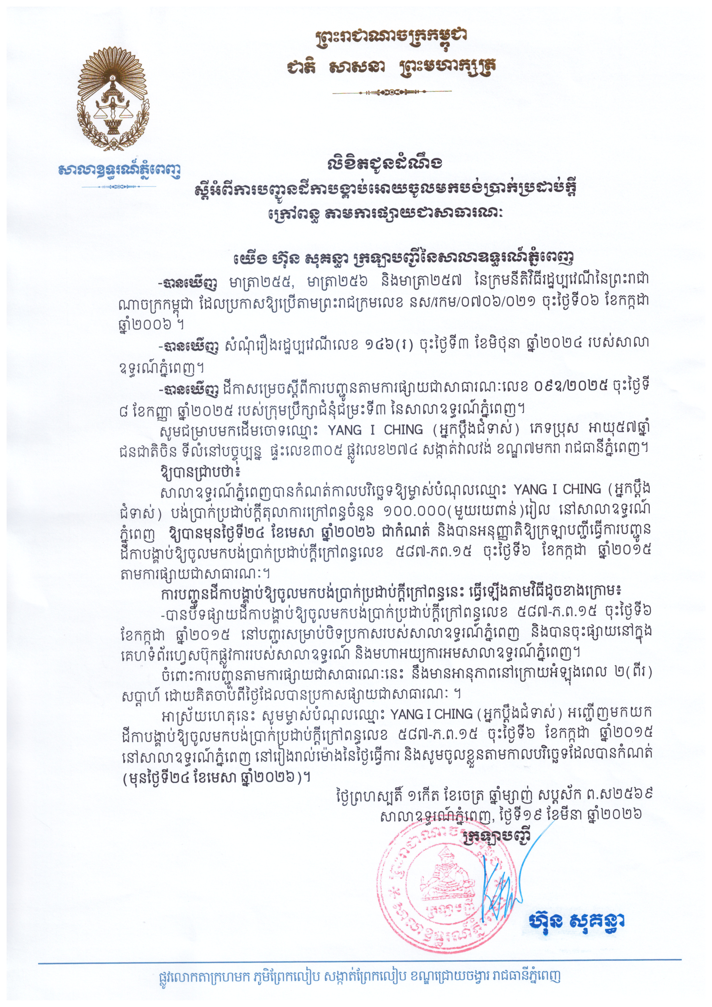 លិខិតជូនដំណឹងអំពីការបញ្ជូនដីកាកោះតាមការផ្សាយជាសាធារណៈ