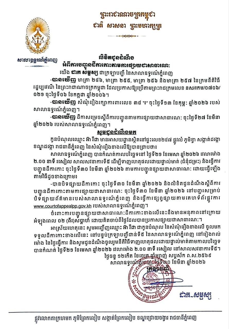 យើង ដាក សម្ផស្ស ក្រឡាបញ្ជីសាលាឧទ្ធរណ៍ភ្នំពេញ សូមជូនដំណឹងមកឈ្មោះ អ៊ា រីដា មានអាសយដ្ឋានបច្ចុប្បន្នស្ថិតនៅផ្ទះលេខ២៤៧ ផ្លូវលំ ភូមិខ្វា សង្កាត់ដង្កោ ខណ្ឌដង្កោ រាជធានីភ្នំពេញ ជាភាគីកូនបំណុលនៃសំណុំរឿងរក្សាការពារលេខ ៣៤(រ) ចុះថ្ងៃទី១៣ ខែកុម្ភៈ ឆ្នាំ២០២៦ ឱ្យបានជ្រាបថា សាលាឧទ្ធរណ៍ភ្នំពេញបានកំណត់យកថ្ងៃទី២១ ខែមេសា ឆ្នាំ២០២៦ វេលាម៉ោង ០២ៈ០០នាទីរសៀល នៅសាលសវនាការទី៥ ដើម្បីធ្វើនីតិវិធីទាញហេតុផលដោយផ្ទាល់មាត់។