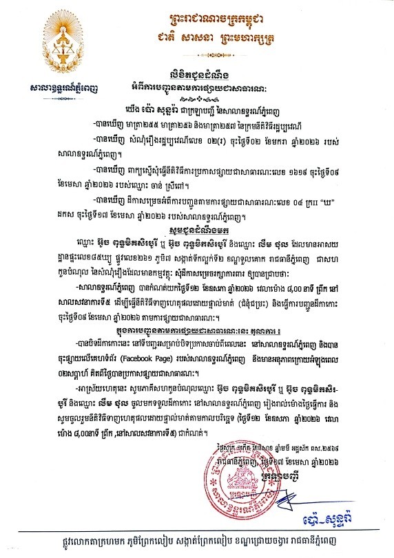 យើង ប៉ោ សុន្ទរ៉ា ក្រឡាបញ្ជីសាលាឧទ្ធរណ៍ភ្នំពេញ សូមជូនដំណឹងមកឈ្មោះ អ៊ូច ពុទ្ធមិគសិរបូរី ឬ អ៊ូច ពុទ្ធមិកសិរបូរី និងឈ្មោះ លឹម ថុល មានអាសយដ្ឋានបច្ចុប្បន្នស្ថិតនៅផ្ទះលេខ៨៥ឃ្យូ ផ្លូវលេខ២៦១ ភូមិ៧ សង្កាត់ទឹកល្អក់ទី២ ខណ្ឌទួលគោក រាជធានីភ្នំពេញ ជាភាគីសហកូនបំណុលនៃសំណុំរឿងរដ្ឋប្បវេណីលេខ ០២(រ) ចុះថ្ងៃទី០២ ខែមករា ឆ្នាំ២០២៦ ឱ្យបានជ្រាបថា សាលាឧទ្ធរណ៍ភ្នំពេញបានកំណត់យកថ្ងៃទី១២ ខែឧសភា ឆ្នាំ២០២៦ វេលាម៉ោង ០៨ៈ០០នាទីព្រឹក នៅសាលសវនាការទី៥ ដើម្បីធ្វើនីតិវិធីទាញហេតុផលដោយផ្ទាល់មាត់។