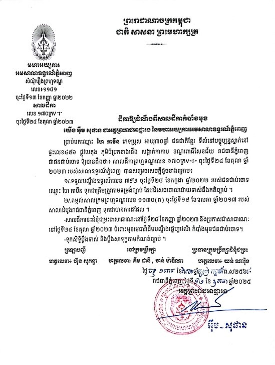 ដីកាសម្រេចអំពីបណ្ដឹងដិតចិត្ត(រឿងព្រហ្មទណ្ឌ)