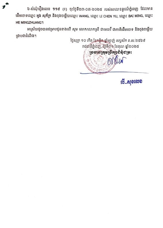អាស្រ័យហេតុនេះ សូមលោក/លោកស្រីជាមេធាវី គូភាគី និងអ្នកពាក់ព័ន្ធក្នុងសំណុំរឿងរដ្ឋប្បវេណី ដែលត្រូវធ្វើនីតិវិធីទាញហេតុផលដោយផ្ទាល់មាត់ដែលនឹងប្រព្រឹត្តទៅនៅថ្ងៃទី ១០ ខែវិច្ឆិកា ឆ្នាំ២០២៥ វេលាម៉ោង ០២ៈ០០នាទីរសៀល នៅសាលសវនាការទី៣ ដែលមានលោក លី សុខលេង ជាប្រធានក្រុមប្រឹក្សាជំនុំជម្រះ មេត្តាជ្រាបជាពត៌មានដោយក្តីអនុគ្រោះ ។