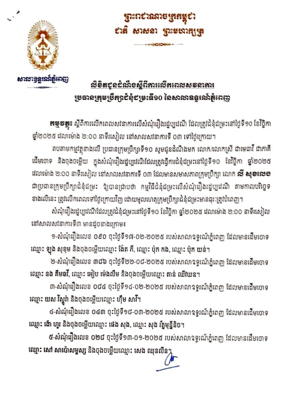 ប្រធានក្រុមប្រឹក្សាជំនុំជម្រះទី១០ នៃសាលាឧទ្ធរណ៍ភ្នំពេញ សូមជូនដំណឹងមក លោក/លោកស្រីជាមេធាវី គូភាគី និងអ្នកពាក់ព័ន្ធក្នុងសំណុំរឿងរដ្ឋប្បវេណី ដែលត្រូវធ្វើនីតិវិធីទាញហេតុផលដោយផ្ទាល់មាត់ដែលនឹងប្រព្រឹត្តទៅនៅថ្ងៃទី ១០ ខែវិច្ឆិកា ឆ្នាំ២០២៥ វេលាម៉ោង ០២ៈ០០នាទីរសៀល នៅសាលសវនាការទី៣ ដែលមានលោក លី សុខលេង ជាប្រធានក្រុមប្រឹក្សាជំនុំជម្រះ ឱ្យបានជ្រាបថា កម្មវិធីទាញហេតុផលដោយផ្ទាល់មាត់តាមកាលបរិច្ឆេទខាងលើ ត្រូវលើកទៅថ្ងៃក្រោយវិញ  ដោយហេតុថា ប្រធានក្រុមប្រឹក្សាជំនុំជម្រះមានធុរៈត្រូវបំពេញ។