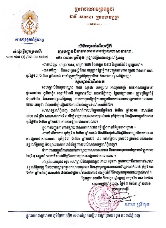 យើង ណាត ស្រីនុច ក្រឡាបញ្ជីសាលាឧទ្ធរណ៍ភ្នំពេញ សូមជូនដំណឹងមកឈ្មោះ ឆាយ សុខជា ភេទប្រុស អាយុ៣៣ឆ្នាំ មានអាសយដ្ឋានបច្ចុប្បន្នស្ថិតនៅផ្ទះលេខ២៨ ភូមិតាង៉ូវ សង្កាត់និរោធិ៍ ខណ្ឌមានជ័យ រាជធានីភ្នំពេញ ជាភាគីសហម្ចាស់បំណុលនៃសំណុំរឿងរដ្ឋប្បវេណីលេខ ១៦៧(រ) ចុះថ្ងៃទី០៣ ខែមិថុនា ឆ្នាំ២០២៤ ឱ្យបានជ្រាបថា សាលាឧទ្ធរណ៍ភ្នំពេញបានកំណត់យកថ្ងៃទី២៧ ខែមីនា ឆ្នាំ២០២៦ វេលាម៉ោង ០៨ៈ០០នាទីព្រឹក នៅសាលសវនាការទី៣ ដើម្បីធ្វើនីតិវិធីទាញហេតុផលដោយផ្ទាល់មាត់។
