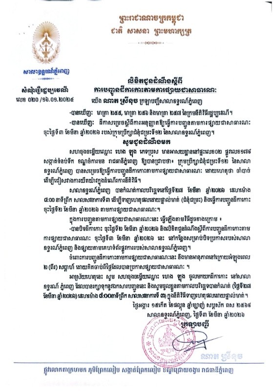 យើង ណាត ស្រីនុច ក្រឡាបញ្ជីសាលាឧទ្ធរណ៍ភ្នំពេញ សូមជូនដំណឹងមកឈ្មោះ ហេង ឡុង ភេទប្រុស មានអាសយដ្ឋានបច្ចុប្បន្នស្ថិតនៅផ្ទះលេខ០២ ផ្លូវលេខ១៧៩ សង្កាត់ទំនប់ទឹក ខណ្ឌចំការមន រាជធានីភ្នំពេញ ជាភាគីសហចុងចម្លើយនៃសំណុំរឿងរដ្ឋប្បវេណីលេខ ០២០ ចុះថ្ងៃទី១៦ ខែមករា ឆ្នាំ២០២៤ ឱ្យបានជ្រាបថា សាលាឧទ្ធរណ៍ភ្នំពេញបានកំណត់យកថ្ងៃទី២៧ ខែមីនា ឆ្នាំ២០២៦ វេលាម៉ោង ០៨ៈ០០នាទីព្រឹក នៅសាលសវនាការទី៣ ដើម្បីធ្វើនីតិវិធីទាញហេតុផលដោយផ្ទាល់មាត់។
