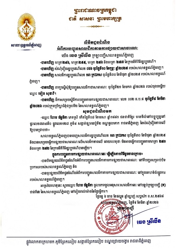 យើង ឆេង ស្រីលីន ក្រឡាបញ្ជីសាលាឧទ្ធរណ៍ភ្នំពេញ សូមជូនដំណឹងមកឈ្មោះ ហែម ច័ន្ទធីតា ភេទស្រី កើតថ្ងៃទី០៨ ខែមេសា ឆ្នាំ១៩៩១ ជនជាតិខ្មែរ មានទីលំនៅសព្វថ្ងៃស្ថិតនៅផ្ទះលេខ៧៣៤អឺ០ ផ្លូវលេខ១២៨ ភូមិ៤ សង្កាត់ផ្សារដេប៉ូទី២ ខណ្ឌទួលគោក រាជធានីភ្នំពេញ ជាភាគីនៃសំណុំរឿងរដ្ឋប្បវេណីលេខ ០៦៦ ចុះថ្ងៃទី ១០ ខែកុម្ភៈ ឆ្នាំ២០២៥ ឱ្យបានជ្រាបថា សាលាឧទ្ធរណ៍ភ្នំពេញបានបើកសវនាការ និងបានចេញសាលដីកាលេខ ១៣ ក្រII.ភ.ស ចុះថ្ងៃទី៣០ ខែមិថុនា ឆ្នាំ២០២៥ និងបានសម្រេចធ្វើការបញ្ជូនតាមការផ្សាយជាសាធារណៈលើសាលដីកាខាងលើ ដោយហេតុថាមិនអាចធ្វើការបញ្ជូនតាមមាត្រា ២៥១, ២៥២ នៃក្រមនីតិវិធីរដ្ឋប្បវេណី បានឡើយ។