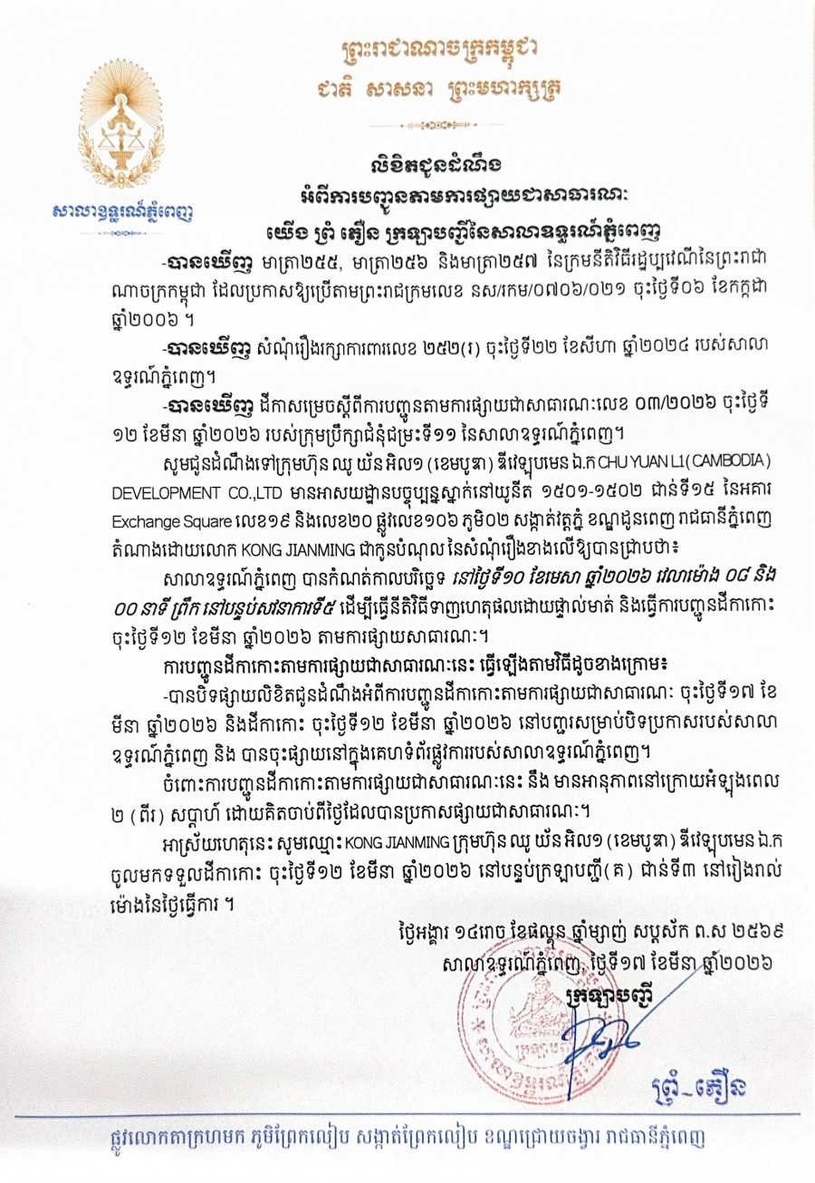 យើង ព្រំ ភឿន ក្រឡាបញ្ជីសាលាឧទ្ធរណ៍ភ្នំពេញ សូមជូនដំណឹងមក ក្រុមហ៊ុន ឈូ យ័នអិល១(ខេមបូឌា) ឌីវេឡុបមេន ឯ.ក CHU YUAN LI(CAMBODIA) DEVELOPMENT CO.,LTD មានអាសយដ្ឋានបច្ចុប្បន្នស្ថិតនៅយូនីត ១៥០១-១៥០២ ជាន់ទី១៥ នៃអគារ EXCHANG SQUARE លេខ១៩ និងលេខ២០ ផ្លូវលេខ១០៦ ភូមិ០២ សង្កាត់វត្តភ្នំ ខណ្ឌដូនពេញ រាជធានីភ្នំពេញ តំណាងដោយឈ្មោះ KONG JIANMING ជាភាគីកូនបំណុលនៃសំណុំរឿងរក្សាការពារលេខ ២៥២(រ) ចុះថ្ងៃទី២២ ខែសីហា ឆ្នាំ២០២៤ ឱ្យបានជ្រាបថា សាលាឧទ្ធរណ៍ភ្នំពេញបានកំណត់យកថ្ងៃទី១០ ខែមេសា ឆ្នាំ២០២៦ វេលាម៉ោង ០៨ៈ០០នាទីព្រឹក នៅសាលសវនាការទី៥ ដើម្បីធ្វើនីតិវិធីទាញហេតុផលដោយផ្ទាល់មាត់។
