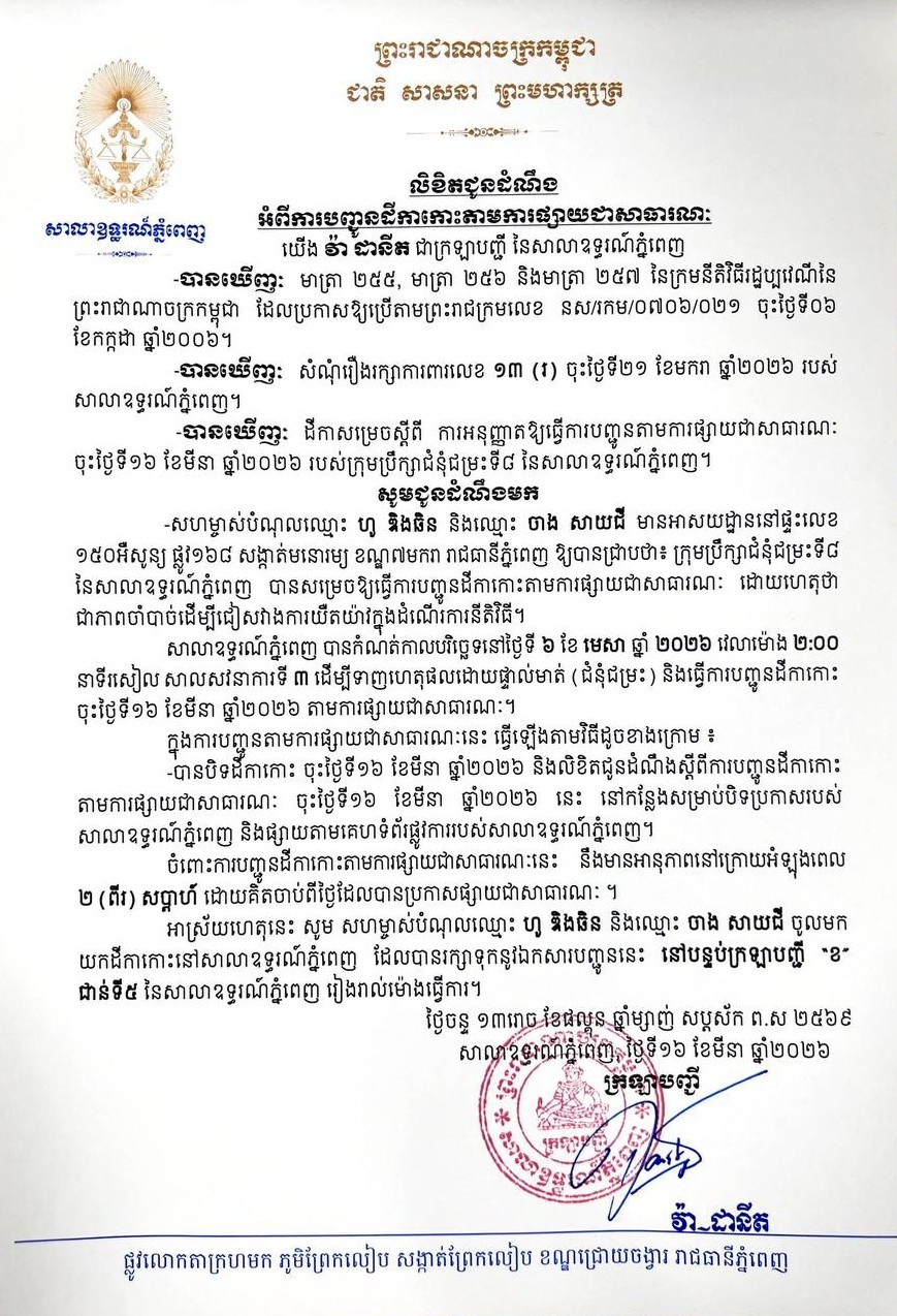 យើង វ៉ា ដានីត ក្រឡាបញ្ជីសាលាឧទ្ធរណ៍ភ្នំពេញ សូមជូនដំណឹងមកឈ្មោះ ហូ ឌិងឆិន និងឈ្មោះ ចាង សាយជី មានអាសយដ្ឋានបច្ចុប្បន្នស្ថិតនៅផ្ទះលេខ១៥០អឺសូន្យ ផ្លូវ១៦៨ សង្កាត់មនោរម្យ ខណ្ឌ៧មករា រាជធានីភ្នំពេញ ជាភាគីសហម្ចាស់បំណុលនៃសំណុំរឿងរដ្ឋប្បវេណីលេខ ១៣(រ) ចុះថ្ងៃទី២១ ខែមករា ឆ្នាំ២០២៦ ឱ្យបានជ្រាបថា សាលាឧទ្ធរណ៍ភ្នំពេញបានកំណត់យកថ្ងៃទី៦ ខែមេសា ឆ្នាំ២០២៦ វេលាម៉ោង ០២ៈ០០នាទីរសៀល នៅសាលសវនាការទី៣ ដើម្បីធ្វើនីតិវិធីទាញហេតុផលដោយផ្ទាល់មាត់។