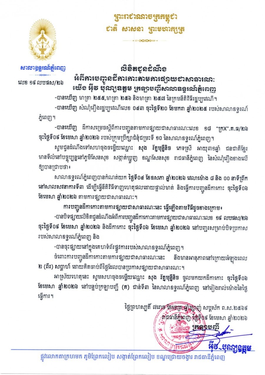 យើង អ៊ីវ បុណ្យឧត្តម ក្រឡាបញ្ជីសាលាឧទ្ធរណ៍ភ្នំពេញ សូមជូនដំណឹងមកឈ្មោះ សុង រ័ត្នមុន្នីនិច ភេទស្រី អាយុ៣១ឆ្នាំ ជនជាតិខ្មែរ មានអាសយដ្ឋានបច្ចុប្បន្នស្ថិតនៅភូមិសែនសុខ សង្កាត់ឃ្មួញ ខណ្ឌសែនសុខ រាជធានីភ្នំពេញ ជាភាគីសហចុងចម្លើយនៃសំណុំរឿងរដ្ឋប្បវេណីលេខ ០៤៣ ចុះថ្ងៃទី២០ ខែមករា ឆ្នាំ២០២៥ ឱ្យបានជ្រាបថា សាលាឧទ្ធរណ៍ភ្នំពេញបានកំណត់យកថ្ងៃទី០៤ ខែឧសភា ឆ្នាំ២០២៦ វេលាម៉ោង ០៨ៈ០០នាទីព្រឹក នៅសាលសវនាការទី៣ ដើម្បីធ្វើនីតិវិធីទាញហេតុផលដោយផ្ទាល់មាត់។