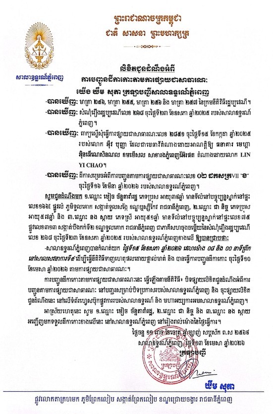 យើង ឃឹម សុភា ក្រឡាបញ្ជីសាលាឧទ្ធរណ៍ភ្នំពេញ សូមជូនដំណឹងមកឈ្មោះ ១.មៀច ច័ន្ទតារ៉ារដ្ឋ ភេទប្រុស អាយុ៣៩ឆ្នាំ មានអាសយដ្ឋានបច្ចុប្បន្នស្ថិតនៅផ្ទះលេខ១៦៦I ផ្លូវលំ ភូមិទួលគោក សង្កាត់ទួលសង្កែ ខណ្ឌឬស្សីកែវ រាជធានីភ្នំពេញ, ២.ជា និច្ច ភេទប្រុស អាយុ៥៧ឆ្នាំ និងឈ្មោះ នង ស្កាយ ភេទស្រី អាយុ៥១ឆ្នាំ មានអាសយដ្ឋានបច្ចុប្បន្នស្ថិតនៅផ្ទះលេខ៧៥ ផ្លូវលេខ៣១៣ សង្កាត់បឹងកក់២ ខណ្ឌទួលគោក រាជធានីភ្នំពេញ ជាភាគីសហចុងចម្លើយនៃសំណុំរឿងរដ្ឋប្បវេណីលេខ ២៦៨ ចុះថ្ងៃទី២៣ ខែឧសភា ឆ្នាំ២០២៥ ឱ្យបានជ្រាបថា សាលាឧទ្ធរណ៍ភ្នំពេញបានកំណត់យកថ្ងៃទី១៥ ខែឧសភា ឆ្នាំ២០២៦ វេលាម៉ោង ០៨ៈ០០នាទីព្រឹក នៅសាលសវនាការទី៤ ដើម្បីធ្វើនីតិវិធីទាញហេតុផលដោយផ្ទាល់មាត់។