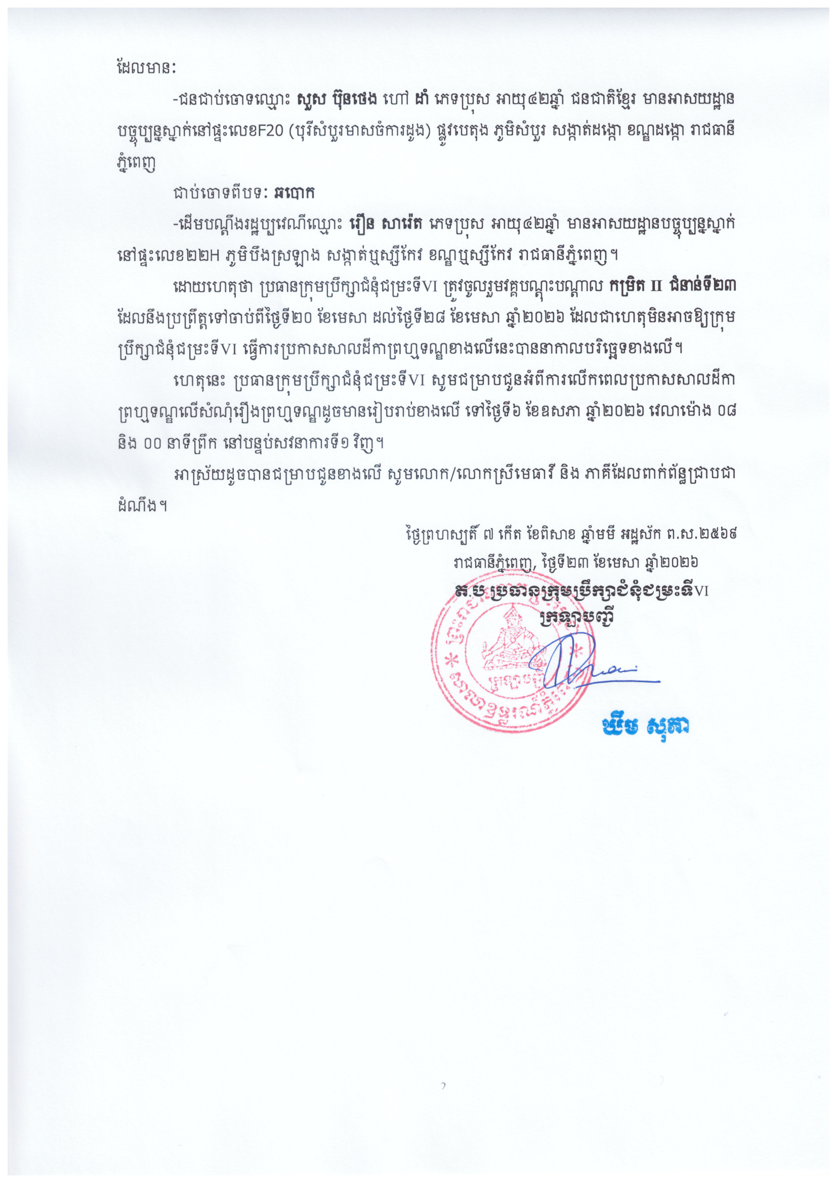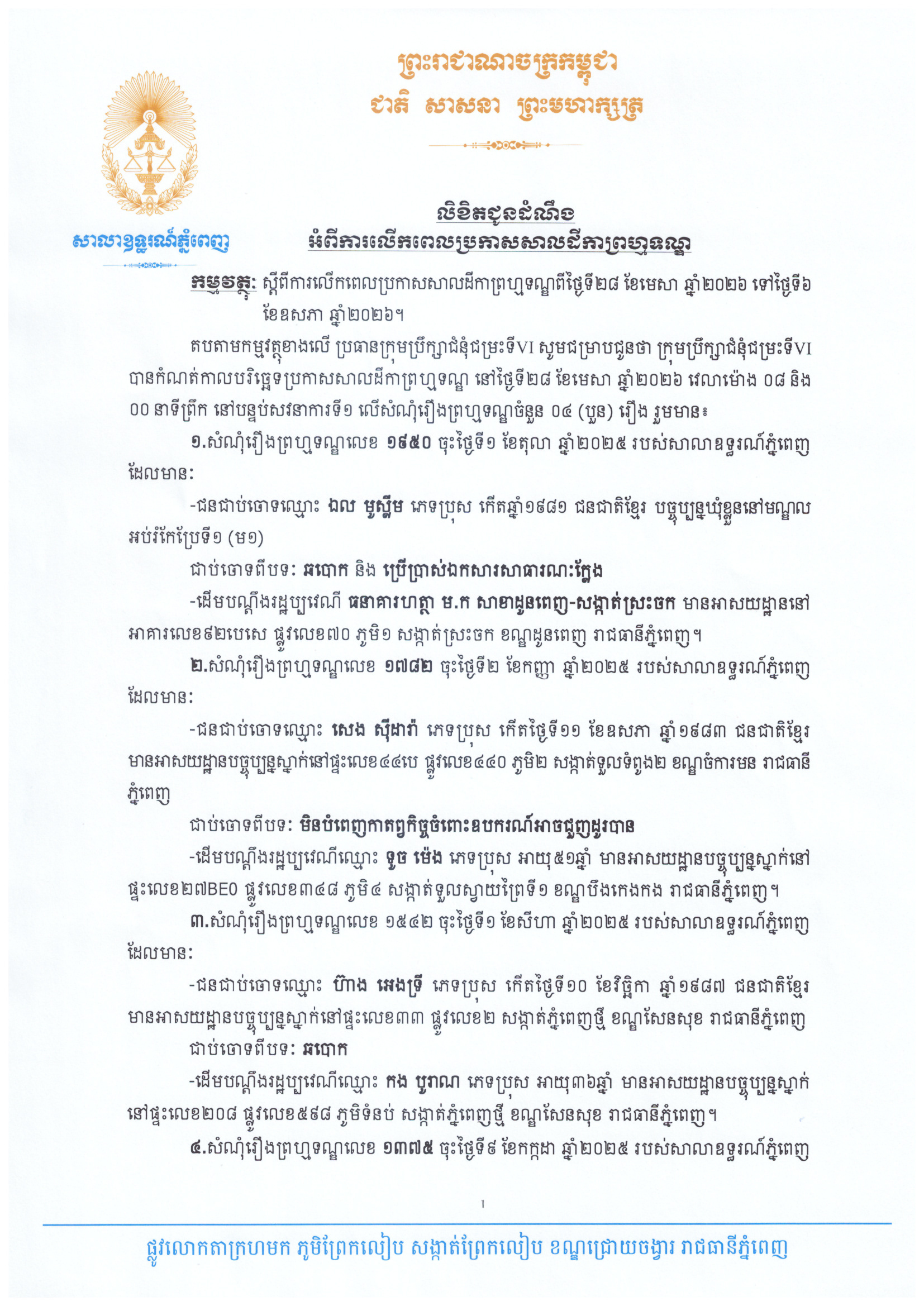 លិខិតជូនដំណឹងស្តីពីការលើកពេលប្រកាសសាលដីកា