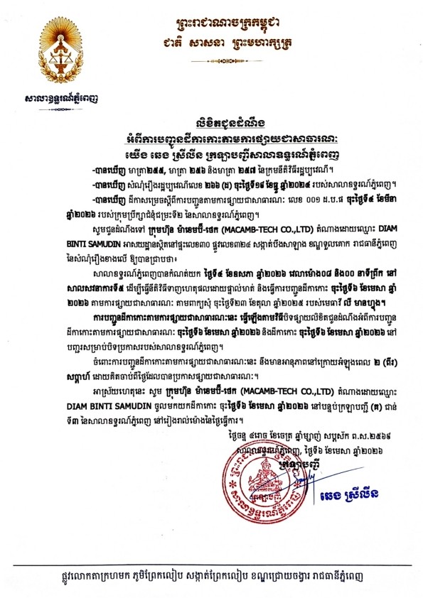 យើង ឆេង ស្រីលីន ក្រឡាបញ្ជីសាលាឧទ្ធរណ៍ភ្នំពេញ សូមជូនដំណឹងមក ក្រុមហ៊ុន ម៉ាខេមប៊ី-ថេក(MACAMB-TECH Co.,LTD) តំណាងដោយឈ្មោះ DIAM BINTI SAMUDIN មានអាសយដ្ឋានបច្ចុប្បន្នស្ថិតនៅផ្ទះលេខ៣០ ផ្លូវលេខ៣២៤ សង្កាត់បឹងសាឡាង ខណ្ឌទួលគោក រាជធានីភ្នំពេញ ជាភាគីនៃសំណុំរឿងរដ្ឋប្បវេណីលេខ ២៦៦(ដ) ចុះថ្ងៃទី១៩ ខែធ្នូ ឆ្នាំ២០២៤ ឱ្យបានជ្រាបថា សាលាឧទ្ធរណ៍ភ្នំពេញបានកំណត់យកថ្ងៃទី៤ ខែឧសភា ឆ្នាំ២០២៦ វេលាម៉ោង ០៨ៈ០០នាទីព្រឹក នៅសាលសវនាការទី៥ ដើម្បីធ្វើនីតិវិធីទាញហេតុផលដោយផ្ទាល់មាត់។