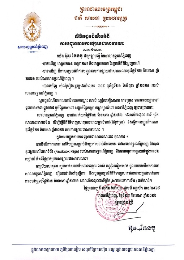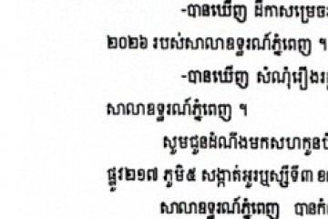 យើង អ៊ុច កែនបូ ក្រឡាបញ្ជីសាលាឧទ្ធរណ៍ភ្នំពេញ សូមជូនដំណឹងមកឈ្មោះ លាស់ ណូរ៉ុលអៀសសាន ភេទប្រុស មានអាសយដ្ឋានបច្ចុប្បន្នស្ថិតនៅផ្ទះលេខ៤៦៣ ផ្លូវ៣៦៩ ភូមិព្រែកតាពៅ សង្កាត់ព្រែកប្រា ខណ្ឌច្បារអំពៅ រាជធានីភ្នំពេញ ជាភាគីសហដើមចោទនៃសំណុំរឿងរដ្ឋប្បវេណីលេខ ៣០៩ ចុះថ្ងៃទី២៦ ខែមិថុនា ឆ្នាំ២០២៥ ឱ្យបានជ្រាបថា សាលាឧទ្ធរណ៍ភ្នំពេញបានកំណត់យកថ្ងៃទី២២ ខែឧសភា ឆ្នាំ២០២៦ វេលាម៉ោង ០៨ៈ០០នាទីព្រឹក នៅសាលសវនាការទី៥ ដើម្បីធ្វើនីតិវិធីទាញហេតុផលដោយផ្ទាល់មាត់។