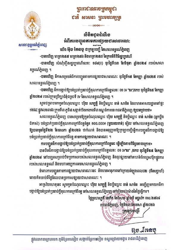 លិខិតជូនដំណឹងអំពីការបញ្ជូនដីកាកោះតាមការផ្សាយជាសាធារណៈ