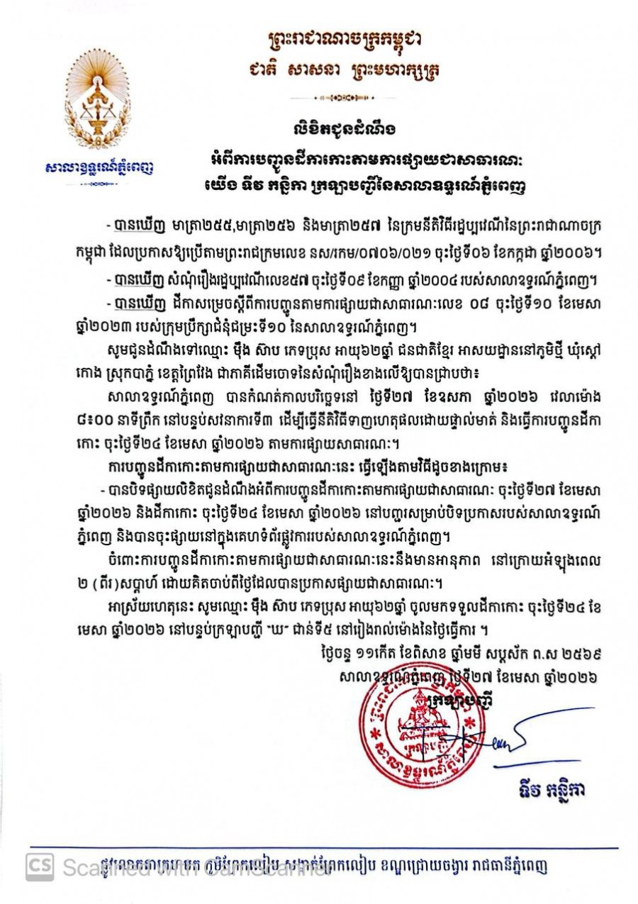 យើង ទីវ កន្និកា ក្រឡាបញ្ជីសាលាឧទ្ធរណ៍ភ្នំពេញ សូមជូនដំណឹងមកឈ្មោះ ម៉ឹង ស៊ាប ភេទប្រុស អាយុ៦២ឆ្នាំ ជនជាតិខ្មែរ មានអាសយដ្ឋានបច្ចុប្បន្នស្ថិតនៅភូមិថ្មី ឃុំស្តៅកោង ស្រុកបាភ្នំ ខេត្តព្រៃវែង ជាភាគីដើមចោទនៃសំណុំរឿងរដ្ឋប្បវេណីលេខ ៥៧ ចុះថ្ងៃទី០៩ ខែកញ្ញា ឆ្នាំ២០០៤ ឱ្យបានជ្រាបថា សាលាឧទ្ធរណ៍ភ្នំពេញបានកំណត់យកថ្ងៃទី២៧ ខែឧសភា ឆ្នាំ២០២៦ វេលាម៉ោង ០៨ៈ០០នាទីព្រឹក នៅសាលសវនាការទី៣ ដើម្បីធ្វើនីតិវិធីទាញហេតុផលដោយផ្ទាល់មាត់។