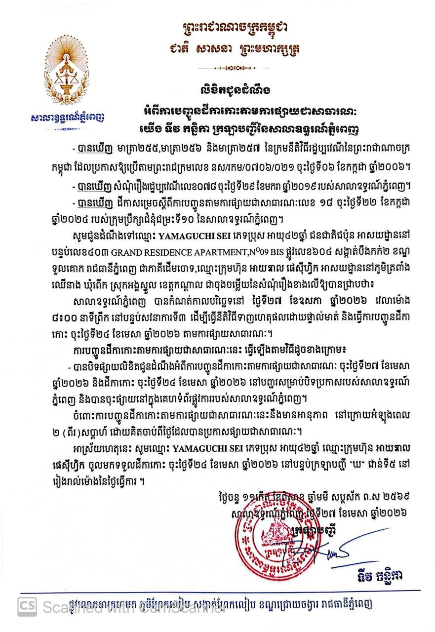 យើង ទីវ កន្និកា ក្រឡាបញ្ជីសាលាឧទ្ធរណ៍ភ្នំពេញ សូមជូនដំណឹងមកឈ្មោះ YAMAGUCHI SEI ភេទប្រុស អាយុ៤២ឆ្នាំ ជនជាតិជប៉ុន មានអាសយដ្ឋានបច្ចុប្បន្នស្ថិតនៅបន្ទប់លេខ៤០៣ GRAND RESIDENCE APARTMENT,No09 BIS ផ្លូវលេខ៦០៤ សង្កាត់បឹងកក់២ ខណ្ឌទួលគោក រាជធានីភ្នំពេញ ជាភាគីដើមចោទ, ឈ្មោះក្រុមហ៊ុន អាយឌាល ផេស៊ីហ្វិក មានអាសយដ្ឋាននៅភូមិត្រពាំងឈើនាង ឃុំពើក ស្រុកអង្គស្នួល ខេត្តកណ្តាល ជាភាគីចុងចម្លើយនៃសំណុំរឿងរដ្ឋប្បវេណីលេខ ០៧៨ ចុះថ្ងៃទី២៩ ខែមករា ឆ្នាំ២០១៩ ឱ្យបានជ្រាបថា សាលាឧទ្ធរណ៍ភ្នំពេញបានកំណត់យកថ្ងៃទី២៧ ខែឧសភា ឆ្នាំ២០២៦ វេលាម៉ោង ០៨ៈ០០នាទីព្រឹក នៅសាលសវនាការទី៣ ដើម្បីធ្វើនីតិវិធីទាញហេតុផលដោយផ្ទាល់មាត់។
