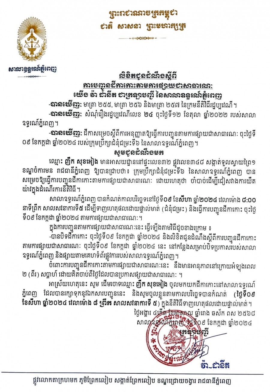 យើង វ៉ា ដានីត ក្រឡាបញ្ជីសាលាឧទ្ធរណ៍ភ្នំពេញ សូមជូនដំណឹងមកឈ្មោះ ញឹក សុខអៀង មានអាសយដ្ឋានបច្ចុប្បន្នផ្ទះលេខ៣២ ផ្លូវលេខ៣៤៨ សង្កាត់ទួលស្វាយព្រៃ១ ខណ្ឌចំការមន រាជធានីភ្នំពេញ ជាភាគីនៃសំណុំរឿងរដ្ឋប្បវេណីលេខ ២៤ ចុះថ្ងៃទី ១២ ខែតុលា ឆ្នាំ២០២២ ឱ្យបានជ្រាបថា សាលាឧទ្ធរណ៍ភ្នំពេញបានកំណត់យកថ្ងៃទី ០៩ ខែសីហា ឆ្នាំ២០២៤ វេលាម៉ោង ០៨ៈ០០នាទីព្រឹក នៅសាលសវនាការទី៥ ដើម្បីធ្វើនីតិវិធីទាញហេតុផលដោយផ្ទាល់មាត់។