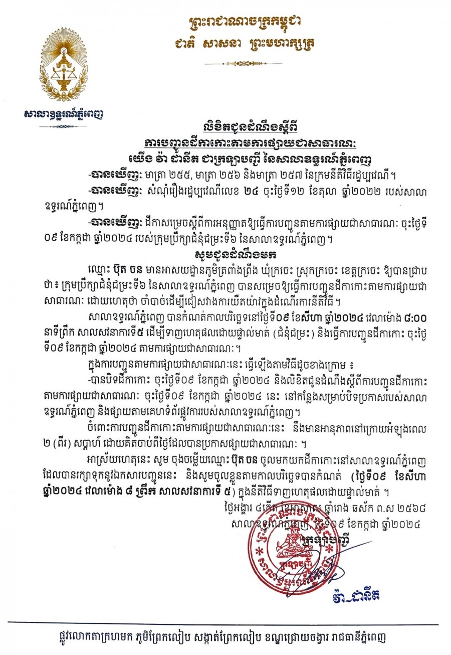 យើង វ៉ា ដានីត ក្រឡាបញ្ជីសាលាឧទ្ធរណ៍ភ្នំពេញ សូមជូនដំណឹងមកឈ្មោះ ប៊ុត ចន មានអាសយដ្ឋានបច្ចុប្បន្នភូមិត្រពាំងព្រីង ឃុំក្រចេះ ស្រុកក្រចេះ ខេត្តក្រចេះ ជាភាគីនៃសំណុំរឿងរដ្ឋប្បវេណីលេខ ២៤ ចុះថ្ងៃទី ១២ ខែតុលា ឆ្នាំ២០២២ ឱ្យបានជ្រាបថា សាលាឧទ្ធរណ៍ភ្នំពេញបានកំណត់យកថ្ងៃទី ០៩ ខែសីហា ឆ្នាំ២០២៤ វេលាម៉ោង ០៨ៈ០០នាទីព្រឹក នៅសាលសវនាការទី៥ ដើម្បីធ្វើនីតិវិធីទាញហេតុផលដោយផ្ទាល់មាត់។