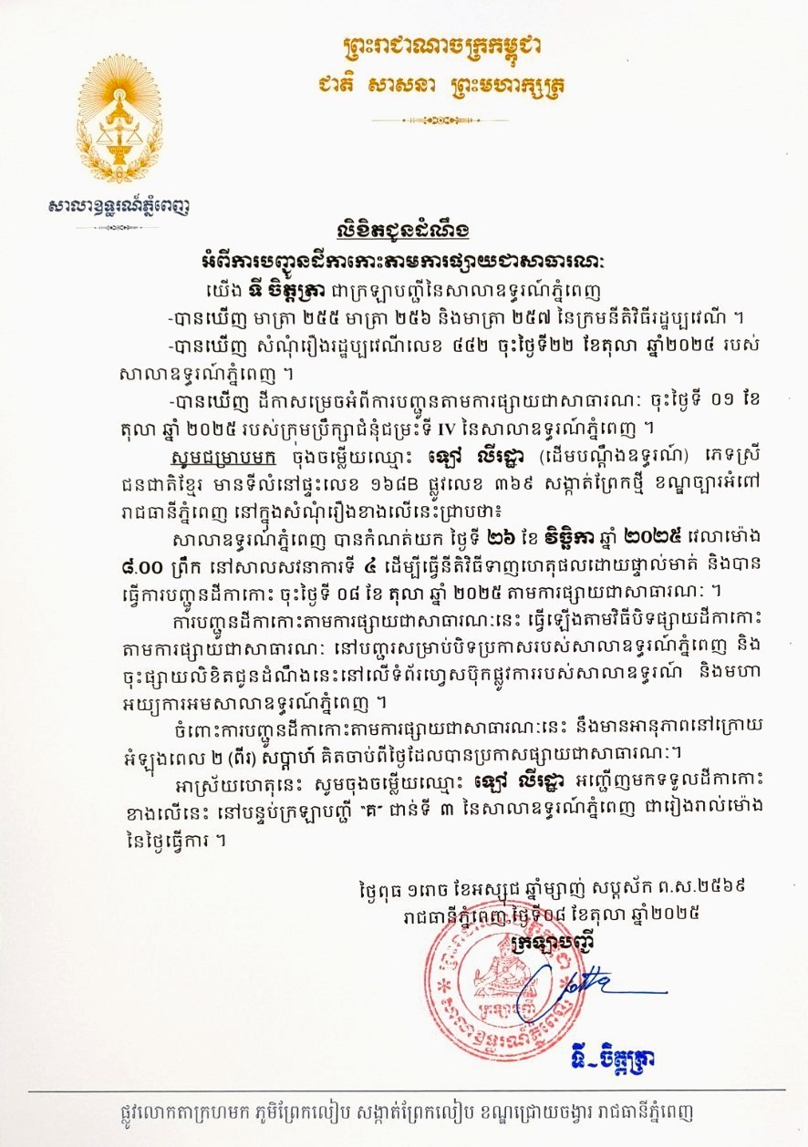 យើង ទី ចិត្តត្រា ក្រឡាបញ្ជីសាលាឧទ្ធរណ៍ភ្នំពេញ សូមជូនដំណឹងទៅចុងចម្លើយឈ្មោះ ឡៅ លីរដ្ឋា(ដើមបណ្តឹងឧទ្ធរណ៍) ភេទស្រី ជនជាតិខ្មែរ មានអាសយដ្ឋានបច្ចុប្បន្នផ្ទះលេខ១៦៨B ផ្លូវលេខ៣៦៩ សង្កាត់ព្រែកថ្មី ខណ្ឌច្បារអំពៅ រាជធានីភ្នំពេញ ជាភាគីចុងចម្លើយនៃសំណុំរឿងរដ្ឋប្បវេណីលេខ ៤៤២ ចុះថ្ងៃទី២២ ខែតុលា ឆ្នាំ២០២៤ ឱ្យបានជ្រាបថា សាលាឧទ្ធរណ៍ភ្នំពេញបានកំណត់យកថ្ងៃទី ២៦ ខែវិច្ឆិកា ឆ្នាំ២០២៥ វេលាម៉ោង ០៨ៈ០០នាទីព្រឹក នៅសាលសវនាការទី៤ ដើម្បីធ្វើនីតិវិធីទាញហេតុផលដោយផ្ទាល់មាត់។