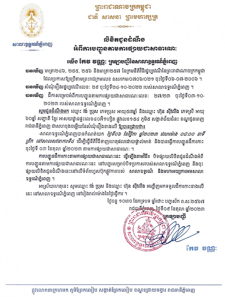 យើង កែវ វណ្ណៈ ក្រឡាបញ្ជីសាលាឧទ្ធរណ៍ភ្នំពេញ សូមជូនដំណឹងមកឈ្មោះ វង់ ប្រុស ភេទប្រុស អាយុ៥៧ឆ្នាំ និងឈ្មោះ ហ៊ុន ស៊ីវលីង ភេទស្រី អាយុ៦០ឆ្នាំ សញ្ជាតិខ្មែរ មានអាសយដ្ឋានបច្ចុប្បន្នផ្ទះលេខ៤០អឺ១ហ្សិត ផ្លូវលេខ១៥៤ ភូមិ៥ សង្កាត់ជ័យជំនះ ខណ្ឌដូនពេញ រាជធានីភ្នំពេញ ជាភាគីសហចុងចម្លើយ នៃសំណុំរឿងរដ្ឋប្បវេណីលេខ ២៩ ចុះថ្ងៃទី ២៤ ខែតុលា ឆ្នាំ២០២២ ឱ្យបានជ្រាបថា សាលាឧទ្ធរណ៍ភ្នំពេញបានកំណត់យកថ្ងៃទី ០៦ ខែវិច្ឆិកា ឆ្នាំ២០២៣ វេលាម៉ោង ០៨ៈ០០នាទីព្រឹក នៅសាលសវនាការទី៤ ដើម្បីធ្វើនីតិវិធីទាញហេតុផលដោយផ្ទាល់មាត់។