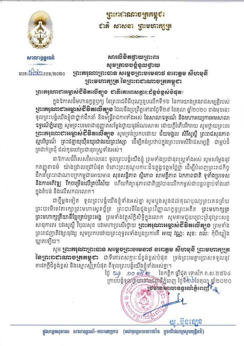សារថ្វាយព្រះពរ ព្រះករុណា ព្រះបាទ សម្តេច ព្រះបរមនាថ នរោត្តម សីហមុនី ព្រះមហាក្សត្រ នៃព្រះរាជាណាចក្រកម្ពុជា ក្នុង ព្រះរាជឱកាស ដ៏មហានក្ខត្តឫក្ស ថ្លៃថ្លា នៃការគ្រងរាជសម្បត្តិ គម្រប់១៦ព្រះវស្សា