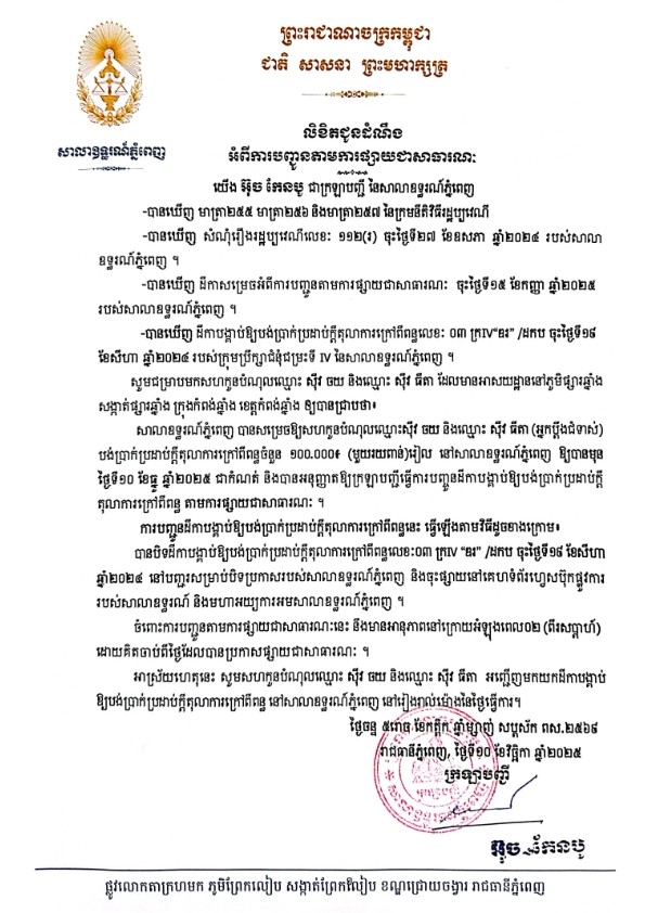 យើង អ៊ុច កែនបូ ក្រឡាបញ្ជីសាលាឧទ្ធរណ៍ភ្នំពេញ សូមជូនដំណឹងទៅសហកូនបំណុលឈ្មោះ ស៊ីវ ចយ និងឈ្មោះ ស៊ីវ ធីតា(អ្នកប្តឹងជំទាស់) មានអាសយដ្ឋានបច្ចុប្បន្នស្ថិតនៅភូមិផ្សារឆ្នាំង សង្កាត់ផ្សារឆ្នាំង ក្រុងកំពង់ឆ្នាំង ខេត្តកំពង់ឆ្នាំង ជាភាគីនៃសំណុំរឿងរដ្ឋប្បវេណីលេខ ១១២(រ) ចុះថ្ងៃទី២៧ ខែឧសភា ឆ្នាំ២០២៤ ឱ្យបានជ្រាបថា ឱ្យភាគីសហកូនបំណូលបង់ប្រាក់ប្រដាប់ក្តីតុលាការក្រៅពីពន្ធចំនួន ១០០.០០០(មួយរយពាន់)រៀល នៅសាលាឧទ្ធរណ៍ភ្នំពេញ ឱ្យបានមុនថ្ងៃទី ១០ ខែធ្នូ ឆ្នាំ២០២៥ ជាកំណត់។