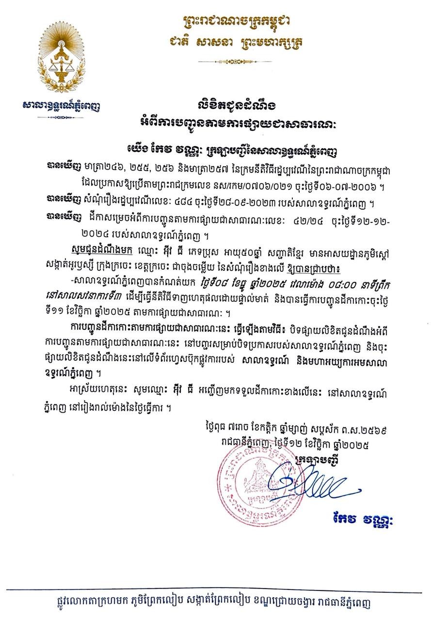 យើង កែវ វណ្ណៈ ក្រឡាបញ្ជីសាលាឧទ្ធរណ៍ភ្នំពេញ សូមជូនដំណឹងទៅឈ្មោះ អ៊ីវ ធី ភេទប្រុស អាយុ៥០ឆ្នាំ សញ្ជាតិខ្មែរ មានអាសយដ្ឋានបច្ចុប្បន្នស្ថិតនៅភូមិស្តៅ សង្កាត់អូរឬស្សី ក្រុងក្រចេះ ខេត្តក្រចេះ ជាភាគីចុងចម្លើយនៃសំណុំរឿងរដ្ឋប្បវេណីលេខ ៤៨៤ ចុះថ្ងៃទី២៨ ខែកញ្ញា ឆ្នាំ២០២៣ ឱ្យបានជ្រាបថា សាលាឧទ្ធរណ៍ភ្នំពេញបានកំណត់យកថ្ងៃទី ០៨ ខែធ្នូ ឆ្នាំ២០២៥ វេលាម៉ោង ០៨ៈ០០នាទីព្រឹក នៅសាលសវនាការទី៣ ដើម្បីធ្វើនីតិវិធីទាញហេតុផលដោយផ្ទាល់មាត់។