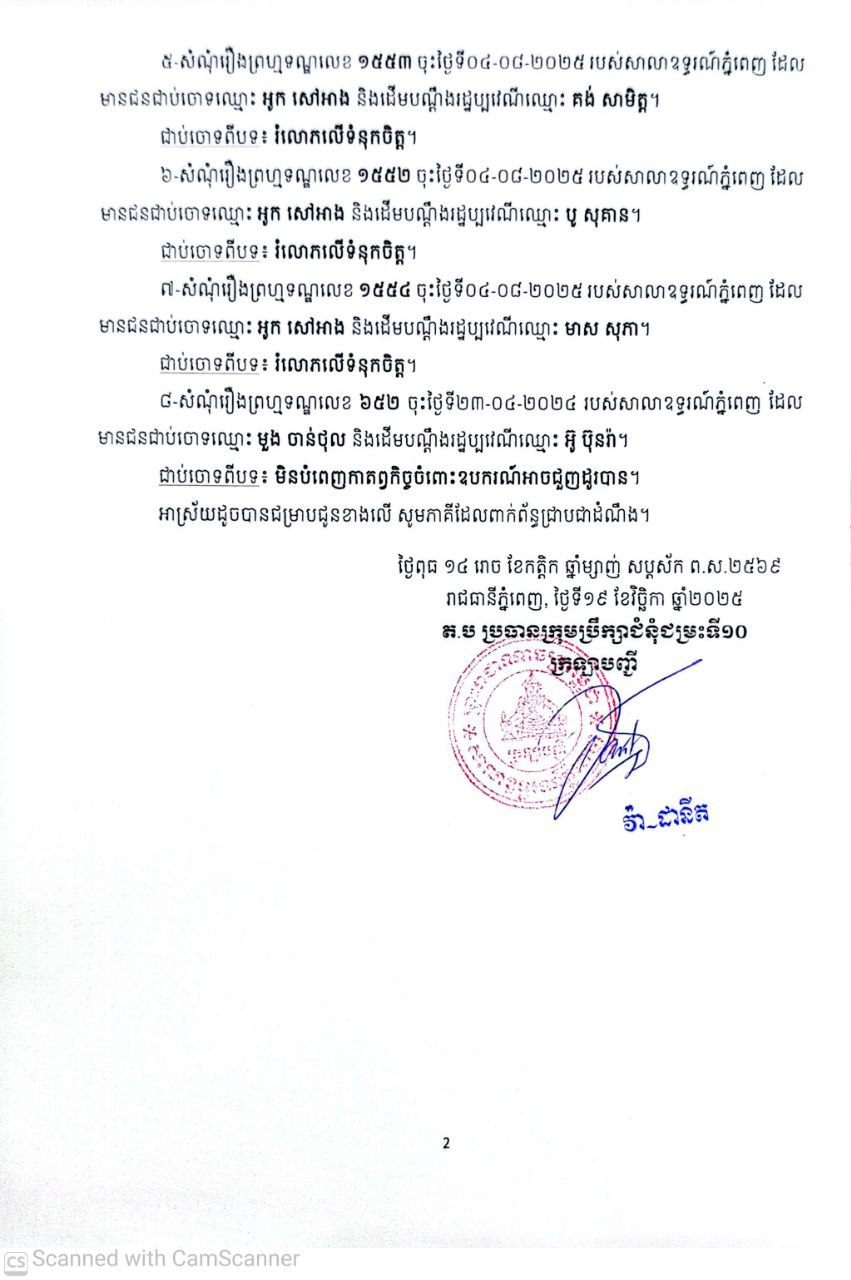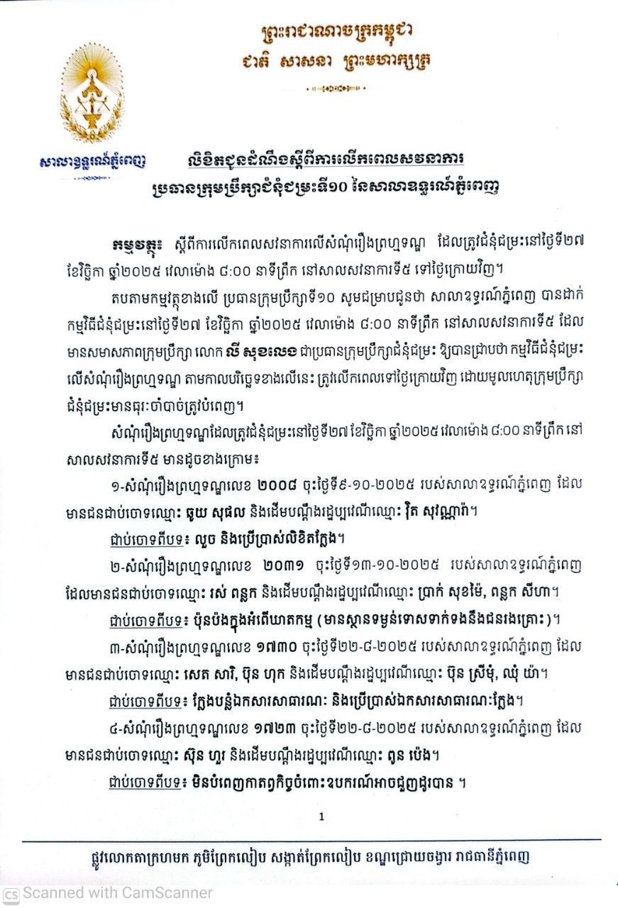 ប្រធានក្រុមប្រឹក្សាជំនុំជម្រះទី១០ នៃសាលាឧទ្ធរណ៍ភ្នំពេញ សូមជូនដំណឹងមក ឯកឧត្តម ឧត្តមអគ្គានុរក្សថ្នាក់លេខ១ អគ្គនាយកនៃអគ្គនាយកដ្ឋានពន្ធនាគារ លោក/លោកស្រីជាមេធាវី ជនជាប់ចោទ ដើមបណ្តឹងរដ្ឋប្បវេណី និងអ្នកពាក់ព័ន្ធសំណុំរឿងព្រហ្មទណ្ឌ ដែលបានធ្វើការកោះហៅ និងអញ្ជើញឱ្យចូលរួមពិភាក្សាដេញដោលដែលនឹងប្រព្រឹត្តទៅនៅថ្ងៃទី ២៧ ខែវិច្ឆិកា ឆ្នាំ២០២៥ វេលាម៉ោង ០៨ៈ០០នាទីព្រឹក នៅសាលសវនាការទី៥ ដែលមានលោក លី សុខលេង ជាប្រធានក្រុមប្រឹក្សាជំនុំជម្រះ ឱ្យបានជ្រាបថា កម្មវិធីពិភាក្សាដេញដោលតាមកាលបរិច្ឆេទខាងលើត្រូវលើកទៅពេលក្រោយវិញ ដោយប្រធានក្រុមប្រឹក្សាជំនុំជម្រះមានធុរៈជាចាំបាច់។