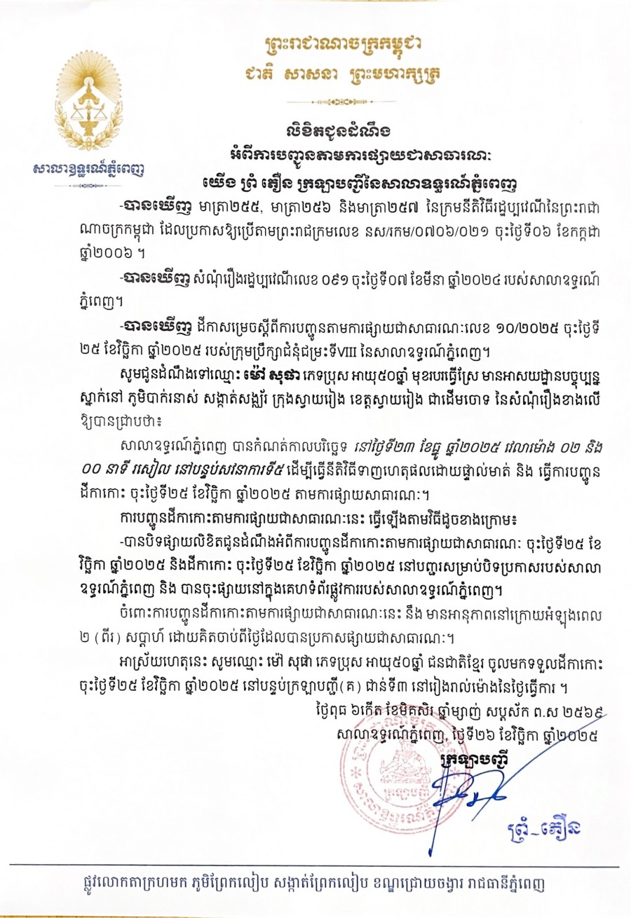 យើង ព្រំ ភឿន ក្រឡាបញ្ជីសាលាឧទ្ធរណ៍ភ្នំពេញ សូមជូនដំណឹងទៅឈ្មោះ ម៉ៅ សុផា ភេទប្រុស អាយុ៥០ឆ្នាំ មុខរបរធ្វើស្រែ មានអាសយដ្ឋានបច្ចុប្បន្នស្ថិតនៅភូមិបាក់រនាស់ សង្កាត់សង្ឃ័រ ក្រុងស្វាយរៀង ខេត្តស្វាយរៀង ជាភាគីដើមចោទនៃសំណុំរឿងរដ្ឋប្បវេណីលេខ ០៩១ ចុះថ្ងៃទី០៧ ខែមីនា ឆ្នាំ២០២៤ ឱ្យបានជ្រាបថា សាលាឧទ្ធរណ៍ភ្នំពេញបានកំណត់យកថ្ងៃទី ២៣ ខែធ្នូ ឆ្នាំ២០២៥ វេលាម៉ោង ០២ៈ០០នាទីរសៀល នៅសាលសវនាការទី៥ ដើម្បីធ្វើនីតិវិធីទាញហេតុផលដោយផ្ទាល់មាត់។