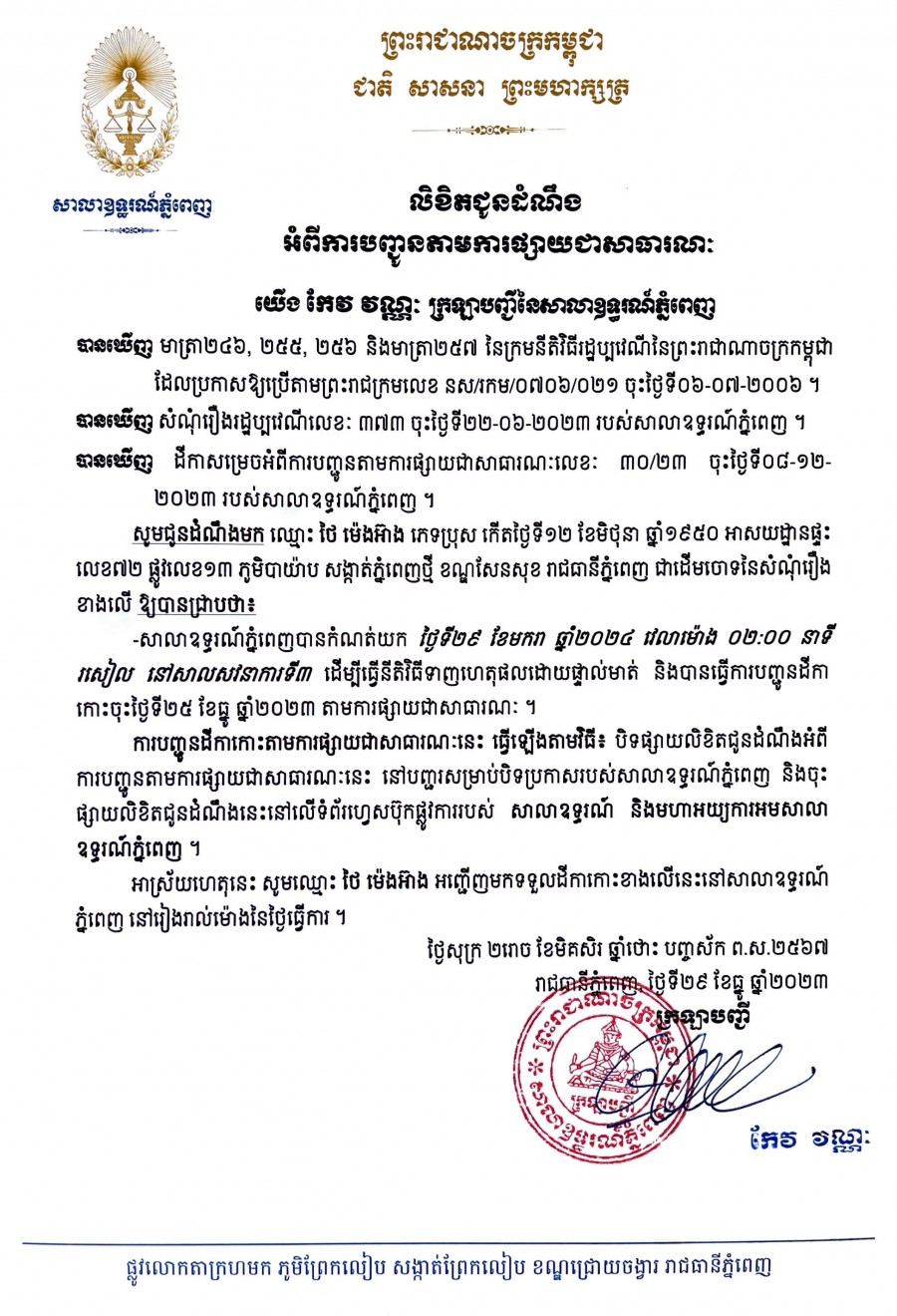 យើង កែវ វណ្ណៈ ក្រឡាបញ្ជីសាលាឧទ្ធរណ៍ភ្នំពេញ សូមជូនដំណឹងមកឈ្មោះ ថៃ ម៉េងអ៊ាង ភេទប្រុស កើតថ្ងៃទី១២ ខែមិថុនា ឆ្នាំ១៩៥០ មានអាសយដ្ឋានបច្ចុប្បន្នផ្ទះលេខ៧២ ផ្លូវលេខ១៣ ភូមិបាយ៉ាប សង្កាត់ភ្នំពេញថ្មី ខណ្ឌសែនសុខ រាជធានីភ្នំពេញ ជាភាគីដើមចោទនៃសំណុំរឿងលេខ ៣៧៣ ចុះថ្ងៃទី ២២ ខែមិថុនា ឆ្នាំ២០២៣ ឱ្យបានជ្រាបថា សាលាឧទ្ធរណ៍ភ្នំពេញបានកំណត់យកថ្ងៃទី២៩ ខែមករា ឆ្នាំ២០២៣ វេលាម៉ោង ០២ៈ០០នាទីរសៀល នៅសាលសវនាការទី៣ ដើម្បីធ្វើនីតិវិធីទាញហេតុផលដោយផ្ទាល់មាត់។
