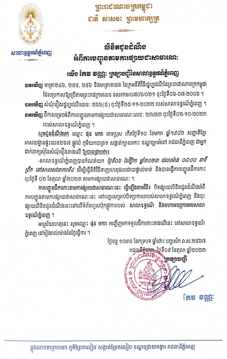 យើង កែវ វណ្ណៈ ក្រឡាបញ្ជីសាលាឧទ្ធរណ៍ភ្នំពេញ សូមជូនដំណឹងមកឈ្មោះ ផុន មករា ភេទប្រុស កើតថ្ងៃទី១០ ខែមករា ឆ្នាំ១៩៨២ សញ្ជាតិខ្មែរ មានអាសយដ្ឋានបច្ចុប្បន្នផ្ទះលេខ២៦៧ ផ្លូវលំ ភូមិយកបាត្រ១ សង្កាត់ក្បាលកោះ ខណ្ច្បារអំពៅញ រាជធានីភ្នំពេញ ជាភាគីអ្នកដាក់ពាក្យសុំ នៃសំណុំរឿងរដ្ឋប្បវេណីលេខ ២៦៦(ដ) ចុះថ្ងៃទី ២៥ ខែវិច្ឆិកា ឆ្នាំ២០២២ ឱ្យបានជ្រាបថា សាលាឧទ្ធរណ៍ភ្នំពេញបានកំណត់យកថ្ងៃទី ០៦ ខែវិច្ឆិកា ឆ្នាំ២០២៣ វេលាម៉ោង ០៨ៈ០០នាទីព្រឹក នៅសាលសវនាការទី៤ ដើម្បីធ្វើនីតិវិធីទាញហេតុផលដោយផ្ទាល់មាត់។