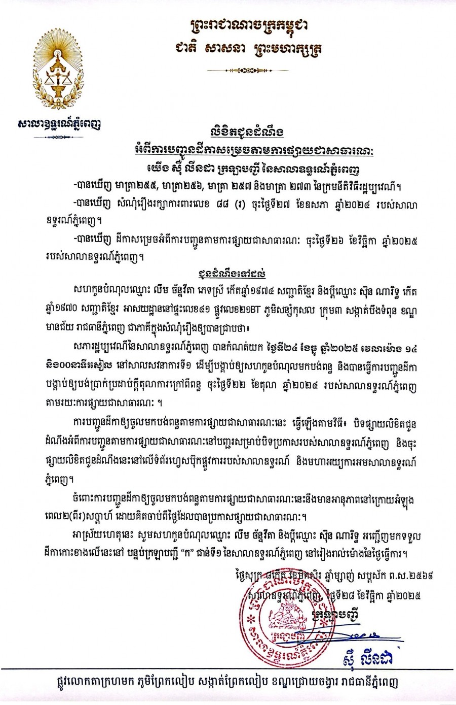 យើង ស៊ឺ លីនដា ក្រឡាបញ្ជីសាលាឧទ្ធរណ៍ភ្នំពេញ សូមជូនដំណឹងទៅសហកូនបំណុលឈ្មោះ លឹម ច័ន្ទវីតា ភេទស្រី កើតឆ្នាំ១៩៧៤ សញ្ជាតិខ្មែរ និងប្តីឈ្មោះ ស៊ុន ណារិទ្ធ កើតឆ្នាំ១៩៧០ សញ្ជាតិខ្មែរ មានអាសយដ្ឋានបច្ចុប្បន្នផ្ទះលេខ៤១ ផ្លូវលេខ២១BT ភូមិសន្សំកុសល ក្រុម៣ សង្កាត់បឹងទំពុន ខណ្ឌមានជ័យ រាជធានីភ្នំពេញ ជាភាគីសហកូនបំណុលនៃសំណុំរឿងរដ្ឋប្បវេណីលេខ ៨៨(រ) ចុះថ្ងៃទី២៧ ខែឧសភា ឆ្នាំ២០២៤ ឱ្យបានជ្រាបថា សាលាឧទ្ធរណ៍ភ្នំពេញបានកំណត់យកថ្ងៃទី ២៤ ខែធ្នូ ឆ្នាំ២០២៥ វេលាម៉ោង ១៤ៈ០០នាទីរសៀល នៅសាលសវនាការទី១ ដើម្បីបង្គាប់ឱ្យសហកូនបំណុលមកបង់ពន្ធ និងបានធ្វើការបញ្ជូនដីកាបង្គាប់ឱ្យបង់ប្រាក់ប្រដាប់ក្តីតុលាការក្រៅពីពន្ធ ចុះថ្ងៃទី២២ ខែតុលា ឆ្នាំ២០២៤ តាមការផ្សាយជាសាធារណៈ។