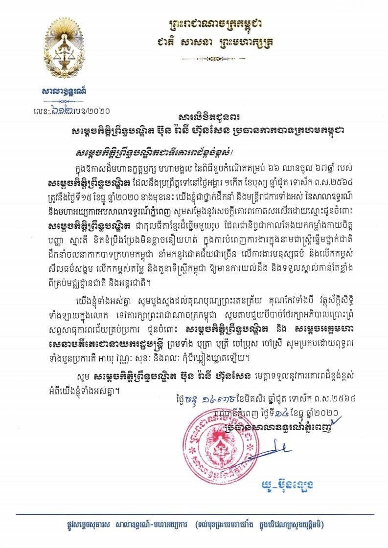 សារលិខិតជូនពរថ្នាក់ដឹកនាំសាលាឧទ្ធរណ៍ និងមហាអយ្យការអមសាលាឧទ្ធរណ៍ភ្នំពេញ គោរពជូនចំពោះសម្តេចកិត្តិព្រឹទ្ធបណ្ឌិត ប៊ុន រ៉ានី ហ៊ុនសែន ប្រធានកាកបាទក្រហមកម្ពុជា ក្នុងឱកាសពិធីខួបកំណើតគម្រប់ ៦៦ ឈានចូល៦៧ឆ្នាំ