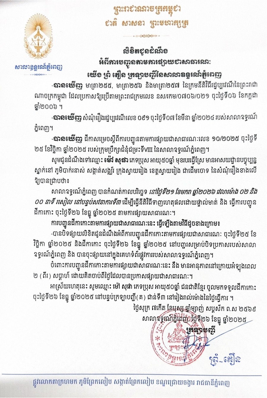 យើង ព្រំ ភឿន ក្រឡាបញ្ជីសាលាឧទ្ធរណ៍ភ្នំពេញ សូមជូនដំណឹងមកឈ្មោះ ម៉ៅ សុផា ភេទប្រុស អាយុ៥០ឆ្នាំ មុខរបរធ្វើស្រែ មានអាសយដ្ឋានបច្ចុប្បន្នស្ថិតនៅភូមិបាក់រនាស់ សង្កាត់សង្ឍ័រ ក្រុងស្វាយរៀង ខេត្តស្វាយរៀង ជាភាគីដើមចោទនៃសំណុំរឿងរដ្ឋប្បវេណីលេខ ០៩១ ចុះថ្ងៃទី៧ ខែមីនា ឆ្នាំ២០២៤ ឱ្យបានជ្រាបថា សាលាឧទ្ធរណ៍ភ្នំពេញបានកំណត់យកថ្ងៃទី ២១ ខែមករា ឆ្នាំ២០២៦ វេលាម៉ោង ០២ៈ០០នាទីរសៀល នៅសាលសវនាការទី៣ ដើម្បីធ្វើនីតិវិធីទាញហេតុផលដោយផ្ទាល់មាត់។