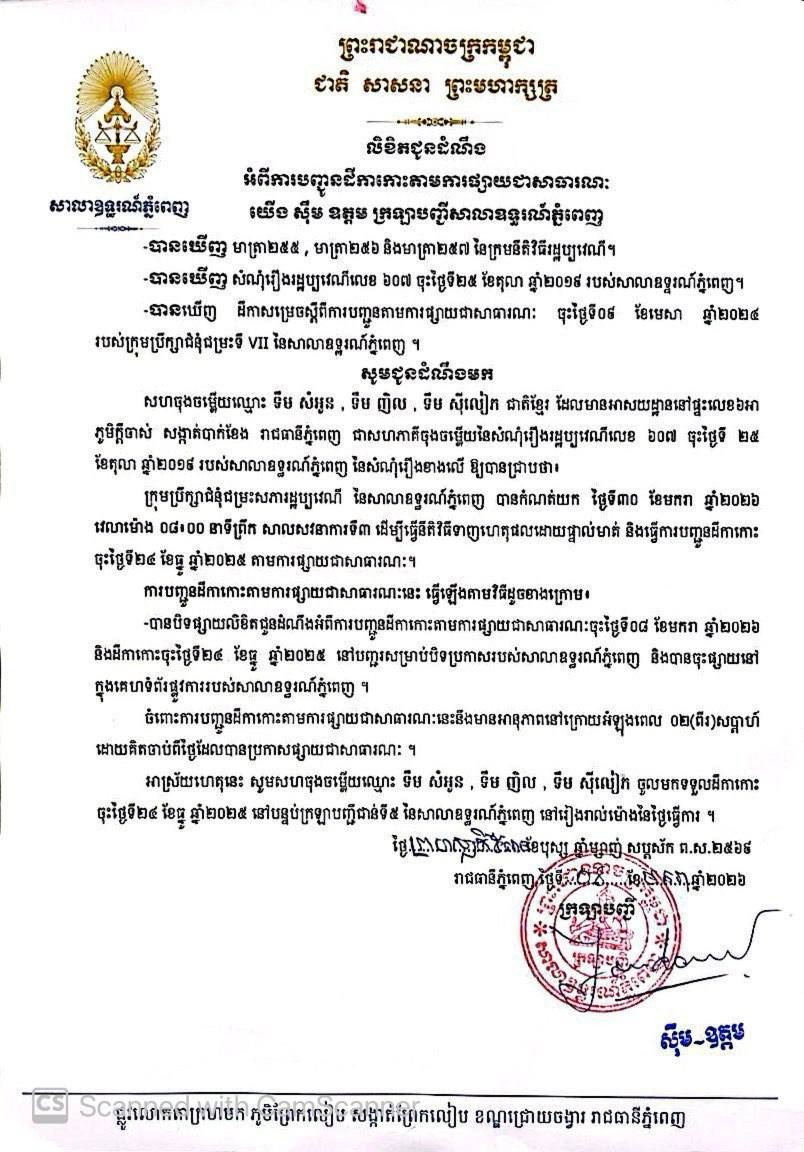 យើង ស៊ឹម ឧត្តម ក្រឡាបញ្ជីសាលាឧទ្ធរណ៍ភ្នំពេញ សូមជូនដំណឹងទៅឈ្មោះ ទឹម សំអូន, ទឹម ញិល, ទឹម ស៊ីលៀក ជាតិខ្មែរ មានអាសយដ្ឋានបច្ចុប្បន្នស្ថិតនៅផ្ទះលេខ៦អា ភូមិក្តីចាស់ សង្កាត់បាក់ខែង រាជធានីភ្នំពេញ ជាភាគីសហចុងចម្លើយនៃសំណុំរឿងរដ្ឋប្បវេណីលេខ ៦០៧ ចុះថ្ងៃទី២៥ ខែតុលា ឆ្នាំ២០១៩ ឱ្យបានជ្រាបថា សាលាឧទ្ធរណ៍ភ្នំពេញបានកំណត់យកថ្ងៃទី ៣០ ខែមករា ឆ្នាំ២០២៦ វេលាម៉ោង ០៨ៈ០០នាទីព្រឹក នៅសាលសវនាការទី៣ ដើម្បីធ្វើនីតិវិធីទាញហេតុផលដោយផ្ទាល់មាត់។