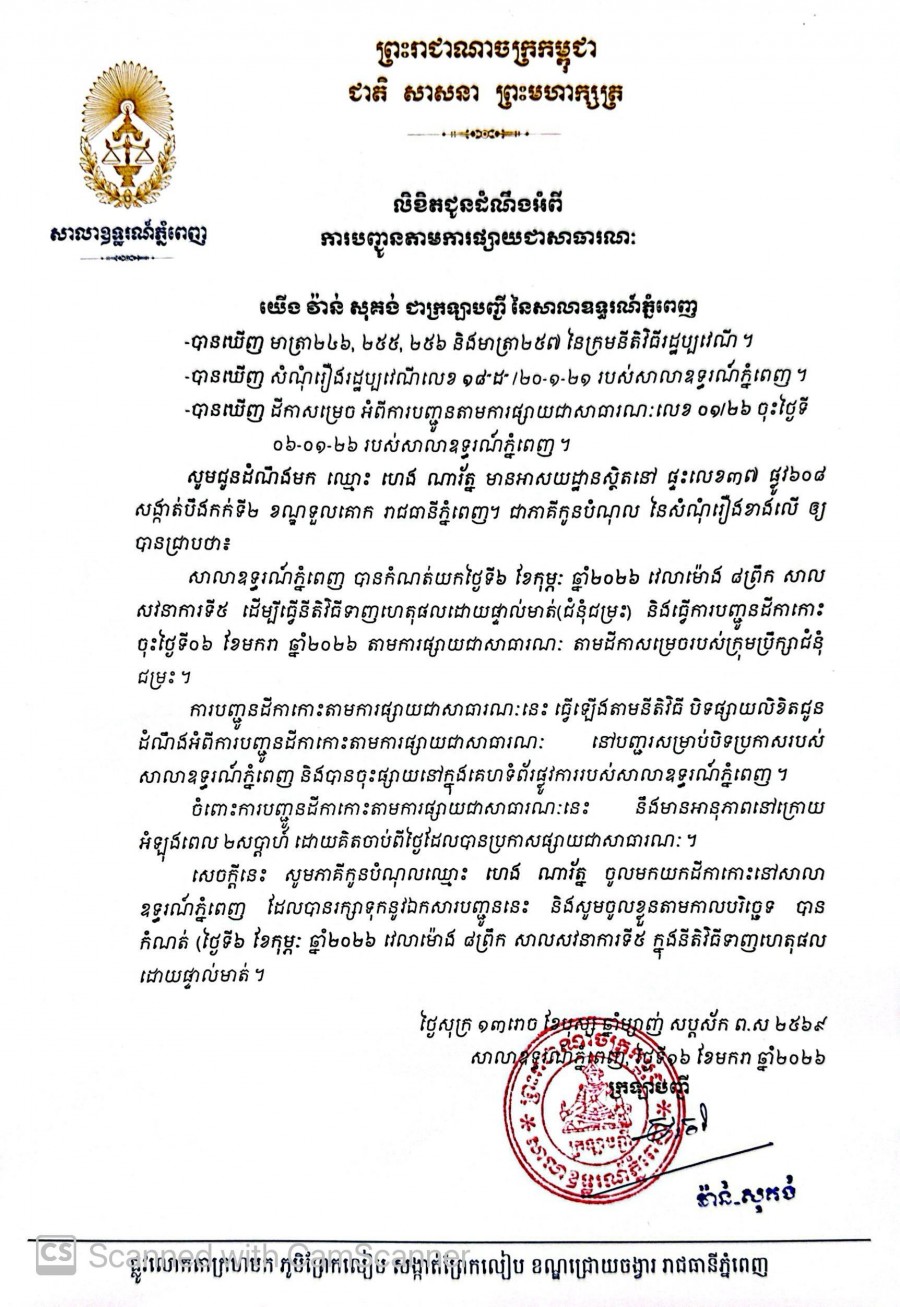 យើង វ៉ាន់ សុគង់ ក្រឡាបញ្ជីសាលាឧទ្ធរណ៍ភ្នំពេញ សូមជូនដំណឹងមកឈ្មោះ ហេង ណារ័ត្ន មានអាសយដ្ឋានបច្ចុប្បន្នស្ថិតនៅផ្ទះលេខ៣៧ ផ្លូវ៦០៨ សង្កាត់បឹងកក់ទី២ ខណ្ឌទួលគោក រាជធានីភ្នំពេញ ជាភាគីកូនបំណុលនៃសំណុំរឿងរដ្ឋប្បវេណីលេខ ១៨"ដ" ចុះថ្ងៃទី២០ ខែមករា ឆ្នាំ២០២១ ឱ្យបានជ្រាបថា សាលាឧទ្ធរណ៍ភ្នំពេញបានកំណត់យកថ្ងៃទី៦ ខែកុម្ភៈ ឆ្នាំ២០២៦ វេលាម៉ោង ០៨ៈ០០នាទីព្រឹក នៅសាលសវនាការទី៥ ដើម្បីធ្វើនីតិវិធីទាញហេតុផលដោយផ្ទាល់មាត់។