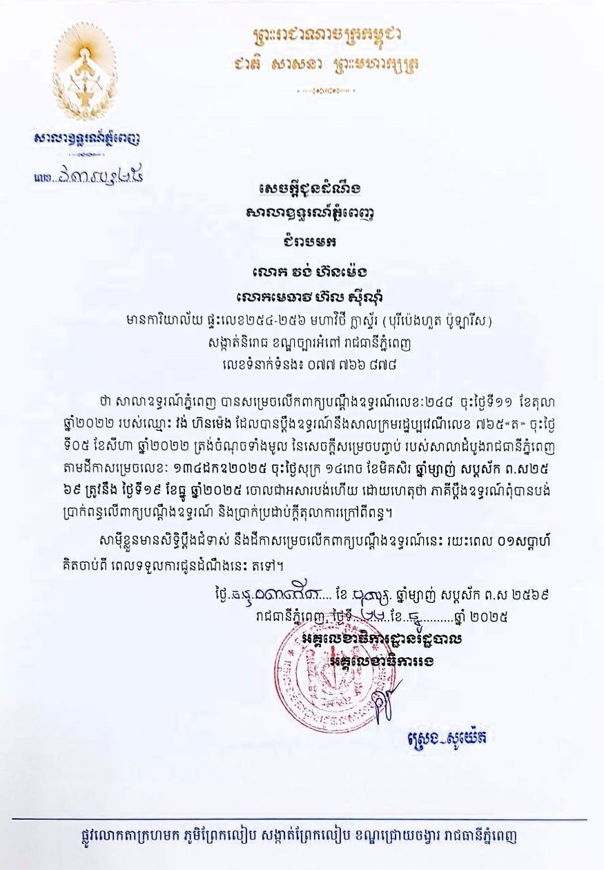 សាលាឧទ្ធរណ៍ភ្នំពេញ ជម្រាបមកលោក វង់ ហ៊នម៉េង លោកមេធាវី ហ៊ល ស៊ីណុំ អាស័យដ្ឋានបច្ចុប្បន្នផ្ទះលេខ២៥៤-២៥៦ មហាវិថីក្លាស្ទ័រ(បុរីប៉េង ហួត ប៉ូឡាវីស) សង្កាត់និរោធ ខណ្ឌច្បារអំពៅ រាជធានីភ្នំពេញ ថា សាលាឧទ្ធរណ៍ភ្នំពេញបានសម្រេចលើកបណ្តឹងឧទ្ធរណ៍លេខ ២៤៨ ចុះថ្ងៃទី១១ ខែតុលា ឆ្នាំ២០២២ ដែលបានប្តឹងឧទ្ធរណ៍នឹងសាលក្រមរដ្ឋប្បវេណីលេខ ៧៦៥(ត) ចុះថ្ងៃទី០៥ ខែសីហា ឆ្នាំ២០២២ ត្រង់ចំណុចទាំងមូលនៃសេចក្តីសម្រេច របស់សាលាដំបូងរាជធានីភ្នំពេញ តាមដីកាសម្រេចលេខ ១៣៤ដកឧ២០២៥ ចុះថ្ងៃសុក្រ ១៤រោច ខែមិគសិរ ឆ្នាំម្សាញ់ សប្តស័ក ព.ស២៥៦៩ ត្រូវនឹងថ្ងៃទី១៩ ខែធ្នូ ឆ្នាំ២០២៥ ចោលជាអសារបង់ហើយ ដោយហេតុថា ពុំបានបង់ប្រាក់ពន្ធលើពាក្យបណ្តឹងឧទ្ធរណ៍ និងប្រាក់ប្រដាប់ក្តីតុលាការក្រៅពីពន្ធ។
