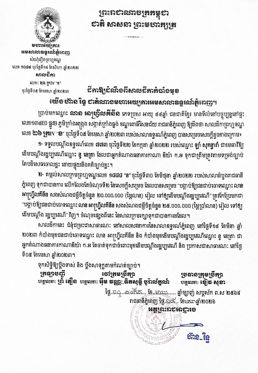 ដីកាសម្រេចលើកពាក្យបណ្ដឹងឧទ្ធរណ៍