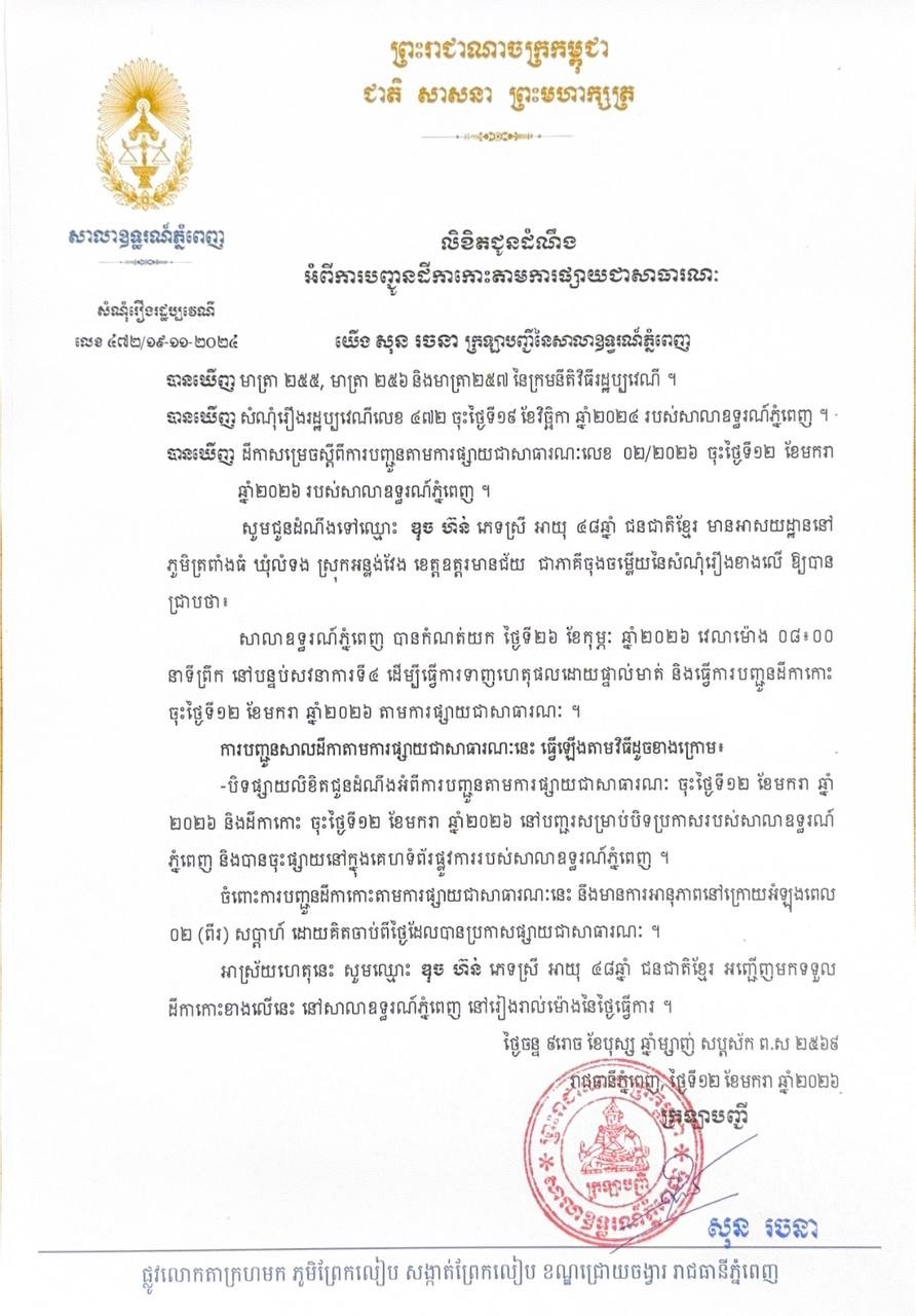 យើង សុន រចនា ក្រឡាបញ្ជីសាលាឧទ្ធរណ៍ភ្នំពេញ សូមជូនដំណឹងមកឈ្មោះ ឌុច ហ៊ន់ ភេទស្រី អាយុ៤៨ឆ្នាំ ជនជាតិខ្មែរ មានអាសយដ្ឋានបច្ចុប្បន្នស្ថិតនៅភូមិភូមិត្រពាំងធំ ឃុំលំទង ស្រុកអន្លង់វែង ខេត្តឧត្តរមានជ័យ ជាភាគីចុងចម្លើយនៃសំណុំរឿងរដ្ឋប្បវេណីលេខ ៤៧២ ចុះថ្ងៃទី១៩ ខែវិច្ឆិកា ឆ្នាំ២០២៤ ឱ្យបានជ្រាបថា សាលាឧទ្ធរណ៍ភ្នំពេញបានកំណត់យកថ្ងៃទី២៦ ខែកុម្ភៈ ឆ្នាំ២០២៦ វេលាម៉ោង ០៨ៈ០០នាទីព្រឹក នៅសាលសវនាការទី៤ ដើម្បីធ្វើនីតិវិធីទាញហេតុផលដោយផ្ទាល់មាត់។