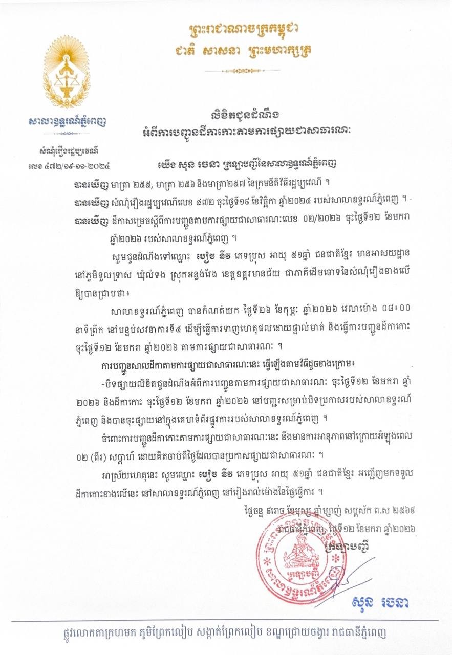 យើង សុន រចនា ក្រឡាបញ្ជីសាលាឧទ្ធរណ៍ភ្នំពេញ សូមជូនដំណឹងមកឈ្មោះ មៀច នីវ ភេទប្រុស អាយុ៥១ឆ្នាំ ជនជាតិខ្មែរ មានអាសយដ្ឋានបច្ចុប្បន្នស្ថិតនៅភូមិភូមិទួលទ្រាស ឃុំលំទង ស្រុកអន្លង់វែង ខេត្តឧត្តរមានជ័យ ជាភាគីដើមចោទនៃសំណុំរឿងរដ្ឋប្បវេណីលេខ ៤៧២ ចុះថ្ងៃទី១៩ ខែវិច្ឆិកា ឆ្នាំ២០២៤ ឱ្យបានជ្រាបថា សាលាឧទ្ធរណ៍ភ្នំពេញបានកំណត់យកថ្ងៃទី២៦ ខែកុម្ភៈ ឆ្នាំ២០២៦ វេលាម៉ោង ០៨ៈ០០នាទីព្រឹក នៅសាលសវនាការទី៤ ដើម្បីធ្វើនីតិវិធីទាញហេតុផលដោយផ្ទាល់មាត់។