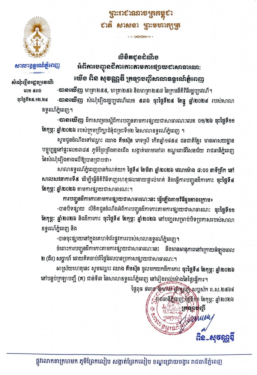 យើង ពិន សុវណ្ណឌី ក្រឡាបញ្ជីសាលាឧទ្ធរណ៍ភ្នំពេញ សូមជូនដំណឹងមកឈ្មោះ ឈាង គឹមស៊ុន ភេទស្រី កើតឆ្នាំ១៩៥៤ ជនជាតិខ្មែរ មានអាសយដ្ឋានបច្ចុប្បន្នស្ថិតនៅផ្ទះលេខ៣៨៥ ភូមិព្រៃព្រីងខាងជើង សង្កាត់ចោមចៅ៣ ខណ្ឌពោធិ៍សែនជ័យ រាជធានីភ្នំពេញ ជាភាគីនៃសំណុំរឿងរដ្ឋប្បវេណីលេខ ៥៣៦ ចុះថ្ងៃទី២៥ ខែធ្នូ ឆ្នាំ២០២៤ ឱ្យបានជ្រាបថា សាលាឧទ្ធរណ៍ភ្នំពេញបានកំណត់យកថ្ងៃទី៤ ខែមីនា ឆ្នាំ២០២៦ វេលាម៉ោង ០៨ៈ០០នាទីព្រឹក នៅសាលសវនាការទី៥ ដើម្បីធ្វើនីតិវិធីទាញហេតុផលដោយផ្ទាល់មាត់។