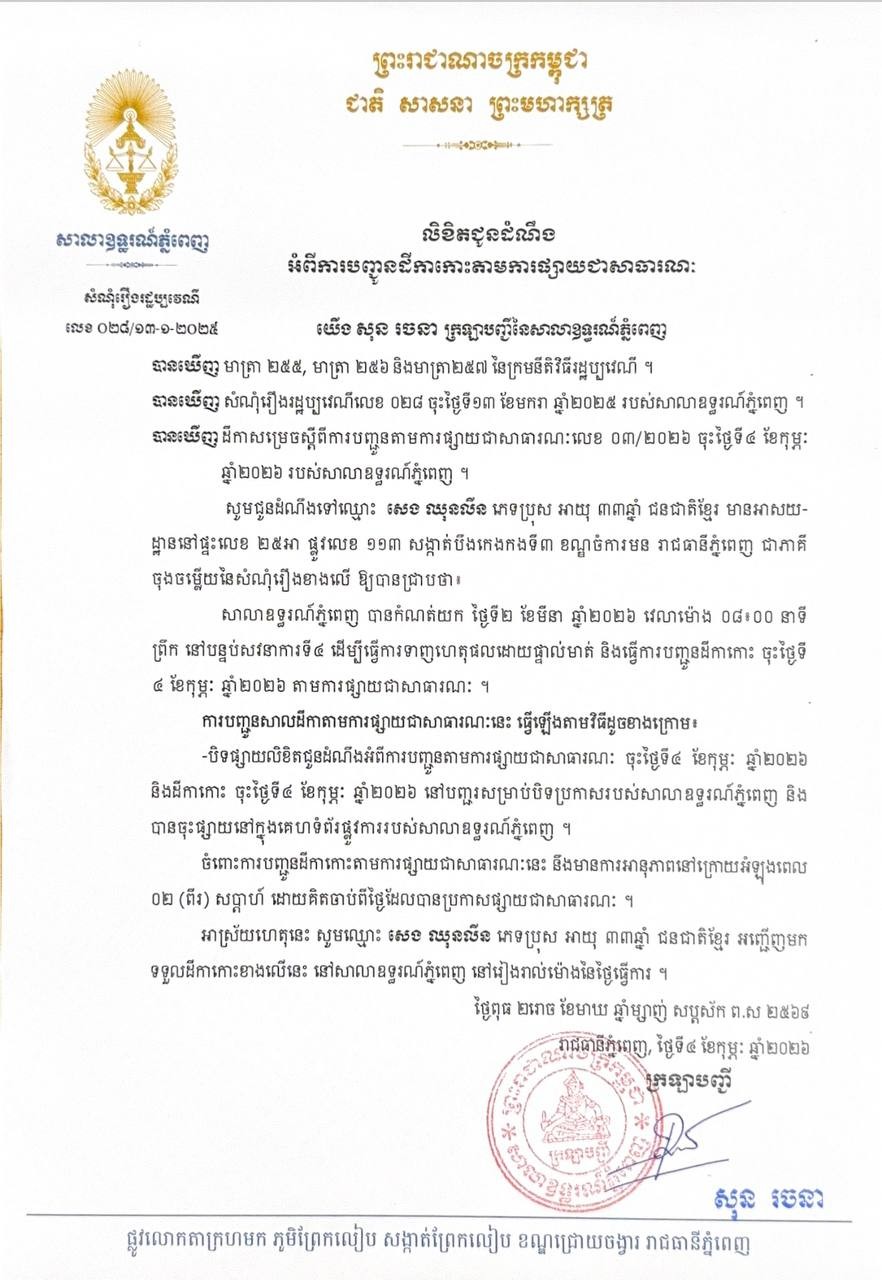 យើង សុន រចនា ក្រឡាបញ្ជីសាលាឧទ្ធរណ៍ភ្នំពេញ សូមជូនដំណឹងមកឈ្មោះ សេង ឈុនលីន ភេទប្រុស អាយុ៣៣ឆ្នាំ ជនជាតិខ្មែរ មានអាសយដ្ឋានបច្ចុប្បន្នស្ថិតនៅផ្ទះលេខ២៥អា ផ្លូវលេខ១១៣ សង្កាត់បឹងកេងកងទី៣ ខណ្ឌចំការមន រាជធានីភ្នំពេញ ជាភាគីចុងចម្លើយនៃសំណុំរឿងរដ្ឋប្បវេណីលេខ ០២៨ ចុះថ្ងៃទី១៣ ខែមករា ឆ្នាំ២០២៥ ឱ្យបានជ្រាបថា សាលាឧទ្ធរណ៍ភ្នំពេញបានកំណត់យកថ្ងៃទី២ ខែមីនា ឆ្នាំ២០២៦ វេលាម៉ោង ០៨ៈ០០នាទីព្រឹក នៅសាលសវនាការទី៤ ដើម្បីធ្វើនីតិវិធីទាញហេតុផលដោយផ្ទាល់មាត់។