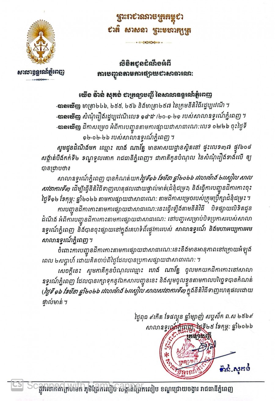 យើង វ៉ាន់ សុគង់ ក្រឡាបញ្ជីសាលាឧទ្ធរណ៍ភ្នំពេញ សូមជូនដំណឹងមកឈ្មោះ ហេង ណារ័ត្ន មានអាសយដ្ឋានបច្ចុប្បន្នស្ថិតនៅផ្ទះលេខ៣៧ ផ្លូវ៦០៨ សង្កាត់បឹងកក់ទី២ ខណ្ឌទួលគោក រាជធានីភ្នំពេញ ជាភាគីកូនបំណុលនៃសំណុំរឿងរដ្ឋប្បវេណីលេខ ១៨(ដ) ចុះថ្ងៃទី២០ ខែមករា ឆ្នាំ២០២១ ឱ្យបានជ្រាបថា សាលាឧទ្ធរណ៍ភ្នំពេញបានកំណត់យកថ្ងៃទី១៦ ខែមីនា ឆ្នាំ២០២៦ វេលាម៉ោង ០២ៈ០០នាទីរសៀល នៅសាលសវនាការទី៣ ដើម្បីធ្វើនីតិវិធីទាញហេតុផលដោយផ្ទាល់មាត់។