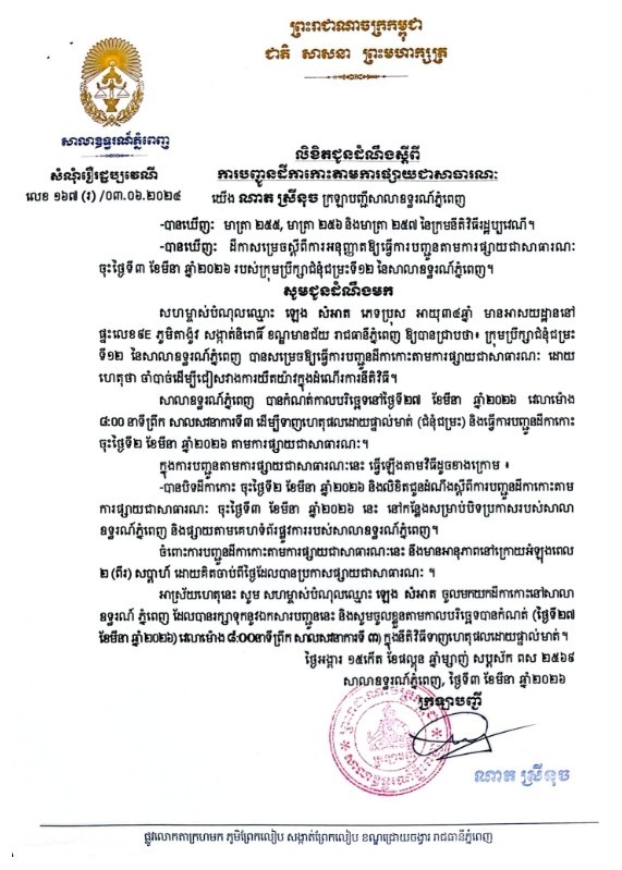 យើង ណាត ស្រីនុច ក្រឡាបញ្ជីសាលាឧទ្ធរណ៍ភ្នំពេញ សូមជូនដំណឹងមកឈ្មោះ ឡេង សំំអាត ភេទប្រុស អាយុ៣៤ឆ្នាំ មានអាសយដ្ឋានបច្ចុប្បន្នស្ថិតនៅផ្ទះលេខ៩E ភូមិតាង៉ូវ សង្កាត់និរោធិ៍ ខណ្ឌមានជ័យ រាជធានីភ្នំពេញ ជាភាគីសហម្ចាស់បំណុលនៃសំណុំរឿងរដ្ឋប្បវេណីលេខ ១៦៧(រ) ចុះថ្ងៃទី០៣ ខែមិថុនា ឆ្នាំ២០២៤ ឱ្យបានជ្រាបថា សាលាឧទ្ធរណ៍ភ្នំពេញបានកំណត់យកថ្ងៃទី២៧ ខែមីនា ឆ្នាំ២០២៦ វេលាម៉ោង ០៨ៈ០០នាទីព្រឹក នៅសាលសវនាការទី៣ ដើម្បីធ្វើនីតិវិធីទាញហេតុផលដោយផ្ទាល់មាត់។