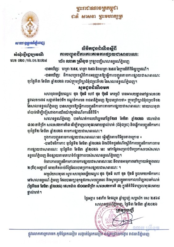 យើង ណាត ស្រីនុច ក្រឡាបញ្ជីសាលាឧទ្ធរណ៍ភ្នំពេញ សូមជូនដំណឹងមកឈ្មោះ ថុង ប៊ុនធី ហៅ ថុន ប៊ុនធី ភេទស្រី មានអាសយដ្ឋានបច្ចុប្បន្នស្ថិតនៅផ្ទះលេខ០២ ផ្លូវលេខ១៧៩ សង្កាត់ទំនប់ទឹក ខណ្ឌចំការមន រាជធានីភ្នំពេញ ជាភាគីសហចុងចម្លើយនៃសំណុំរឿងរដ្ឋប្បវេណីលេខ ០២០ ចុះថ្ងៃទី១៦ ខែមករា ឆ្នាំ២០២៤ ឱ្យបានជ្រាបថា សាលាឧទ្ធរណ៍ភ្នំពេញបានកំណត់យកថ្ងៃទី២៧ ខែមីនា ឆ្នាំ២០២៦ វេលាម៉ោង ០៨ៈ០០នាទីព្រឹក នៅសាលសវនាការទី៣ ដើម្បីធ្វើនីតិវិធីទាញហេតុផលដោយផ្ទាល់មាត់។