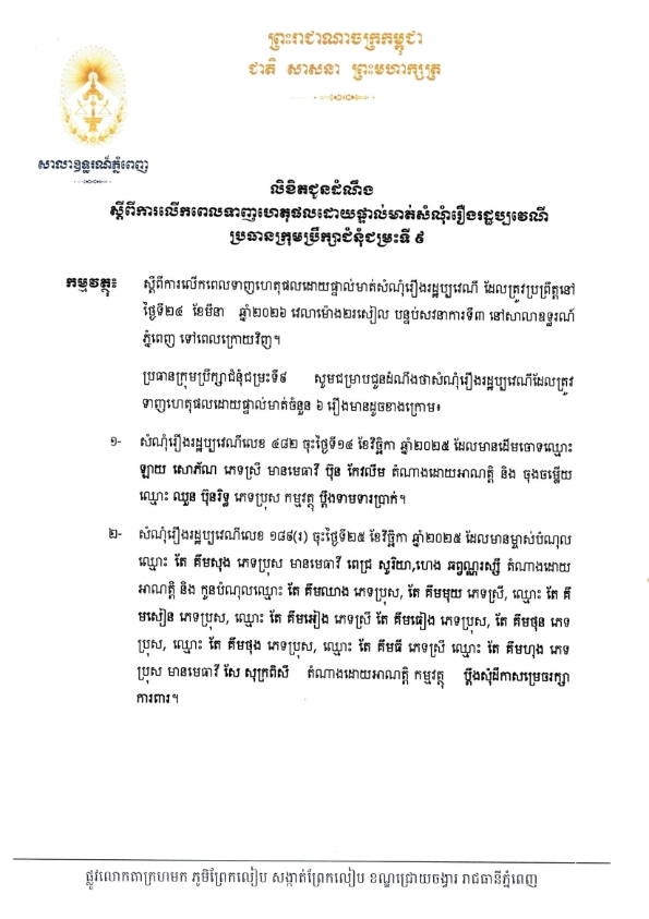 ប្រធានក្រុមប្រឹក្សាជំនុំជម្រះទី៩ នៃសាលាឧទ្ធរណ៍ភ្នំពេញ សូមជូនដំណឹងមក លោក/លោកស្រីជាមេធាវី គូភាគី និងអ្នកពាក់ព័ន្ធក្នុងសំណុំរឿងរដ្ឋប្បវេណី ដែលត្រូវធ្វើនីតិវិធីទាញហេតុផលដោយផ្ទាល់មាត់ដែលនឹងប្រព្រឹត្តទៅនៅថ្ងៃទី ២៤ ខែមីនា ឆ្នាំ២០២៦ វេលាម៉ោង ០២ៈ០០នាទីរសៀល នៅសាលសវនាការទី៣ ដែលមានឯកឧត្តម កូយ សៅ ជាប្រធានក្រុមប្រឹក្សាជំនុំជម្រះ ឱ្យបានជ្រាបថា កម្មវិធីទាញហេតុផលដោយផ្ទាល់មាត់តាមកាលបរិច្ឆេទខាងលើ ត្រូវលើកទៅថ្ងៃក្រោយវិញ ដោយហេតុថា ប្រធានក្រុមប្រឹក្សាជំនុំជម្រះមានធុរៈជាចាំបាច់។