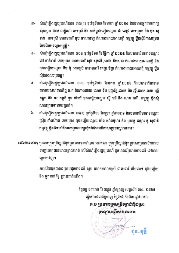 អាស្រ័យហេតុនេះ សូមលោក/លោកស្រីជាមេធាវី គូភាគី និងអ្នកពាក់ព័ន្ធក្នុងសំណុំរឿងរដ្ឋប្បវេណី ដែលត្រូវធ្វើនីតិវិធីទាញហេតុផលដោយផ្ទាល់មាត់ដែលនឹងប្រព្រឹត្តទៅនៅថ្ងៃទី២៤ ខែមីនា ឆ្នាំ២០២៦ វេលាម៉ោង ០២ៈ០០នាទីរសៀល នៅសាលសវនាការទី៣ ដែលមានឯកឧត្តម កូយ សៅ ជាប្រធានក្រុមប្រឹក្សាជំនុំជម្រះ មេត្តាជ្រាបជាពត៌មានដោយក្តីអនុគ្រោះ ។